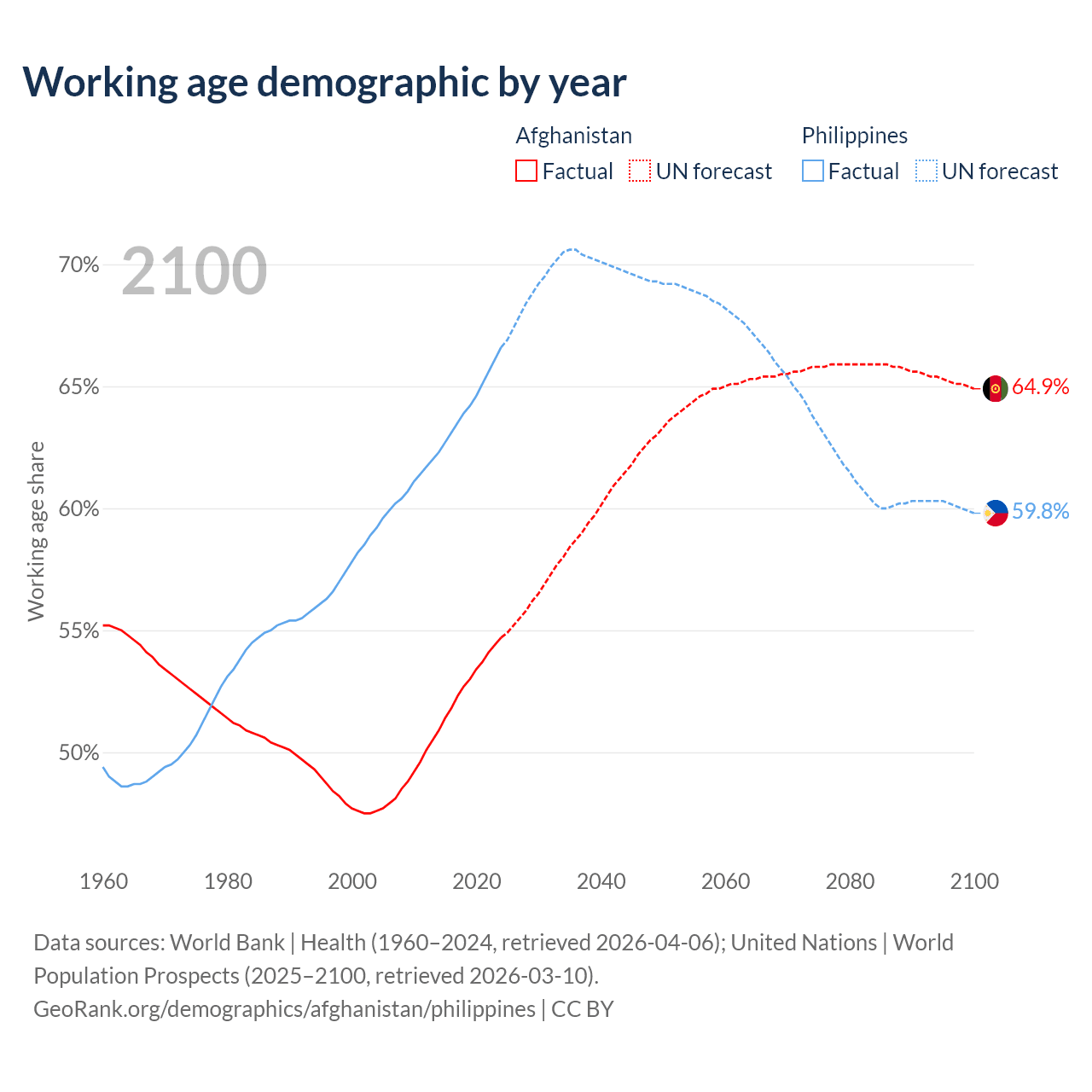 Median age Afghanistan vs Philippines, 1960-2100