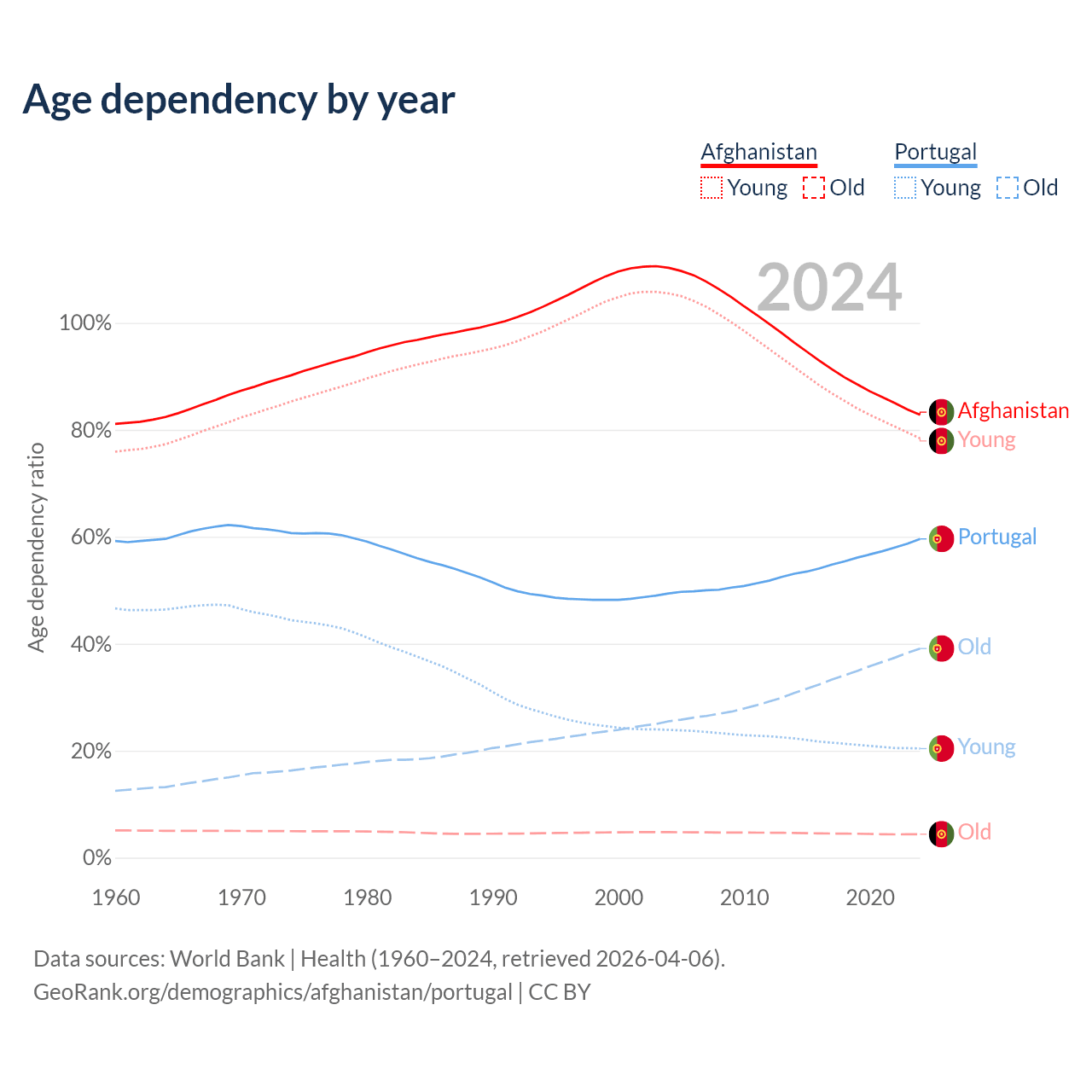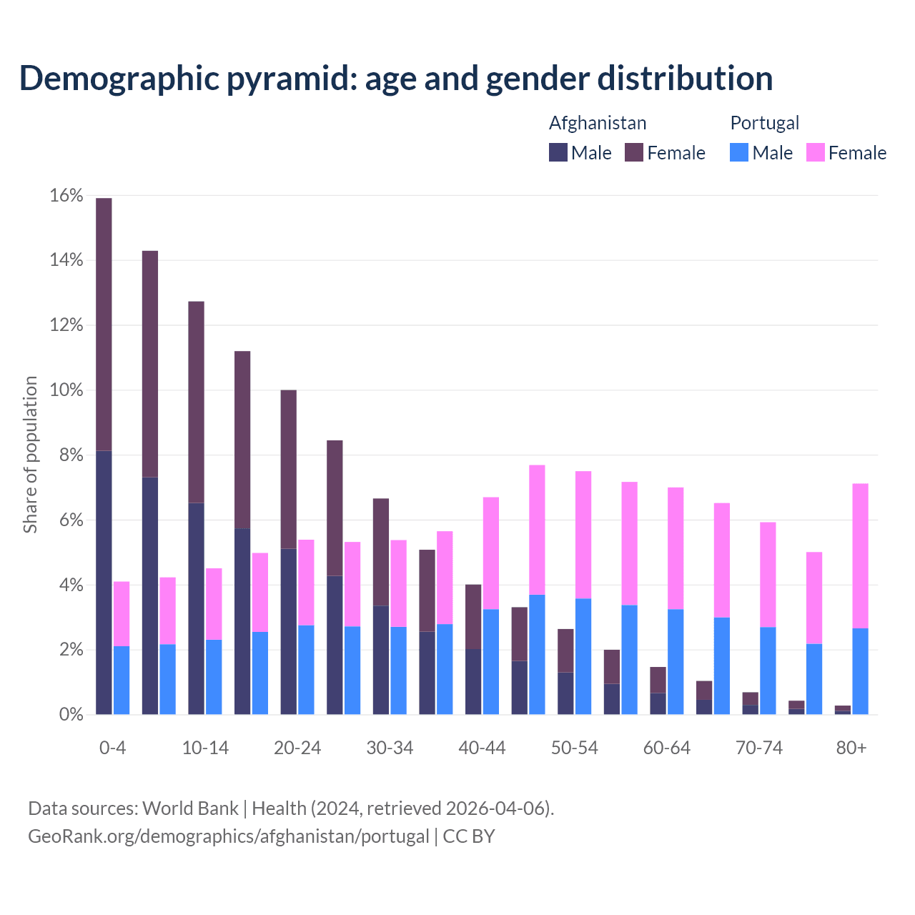 - Afghanistan is ranked 186/196 by median age (oldest to youngest) vs 5/196 for Portugal.