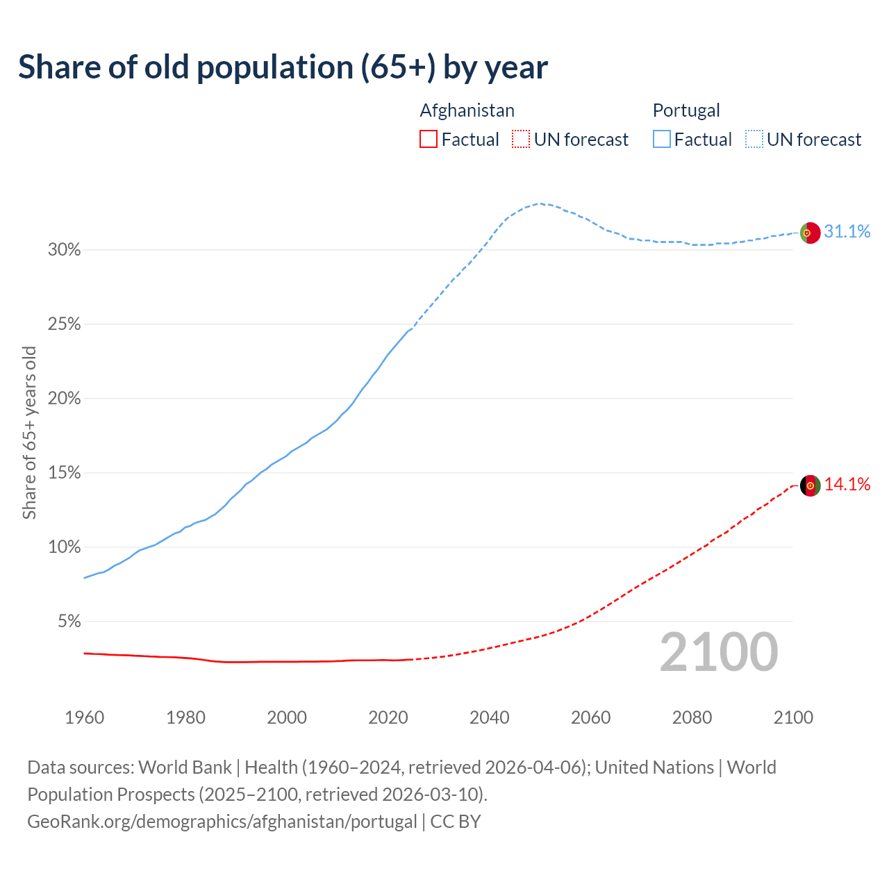 The share of older people aged 65 and over is 2.4% in Afghanistan and 24.5% in Portugal. Life expectancy in Afghanistan compared to Portugal .