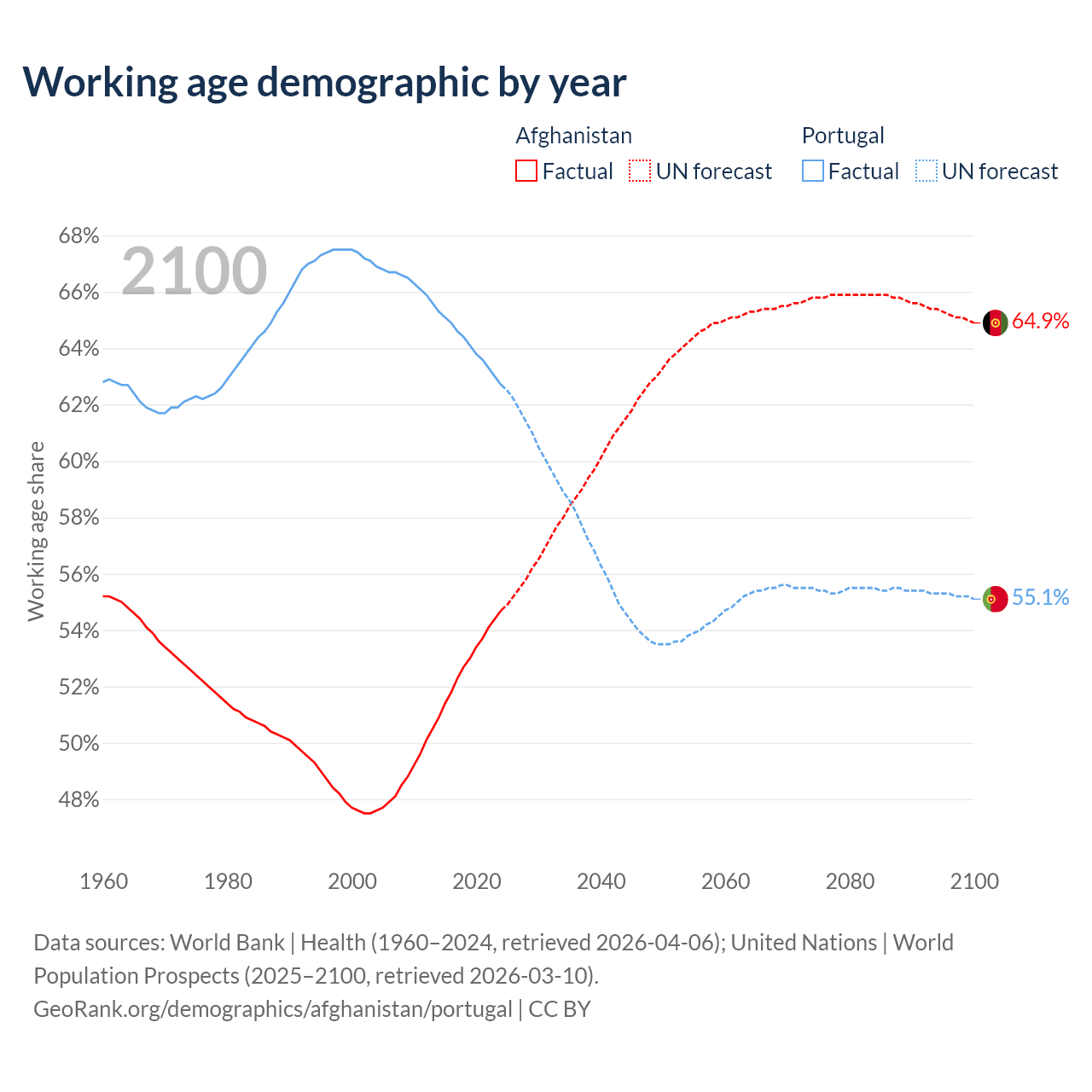 - Afghanistan has 24.8M working age adults (aged 15-64) vs 6.68M in Portugal.