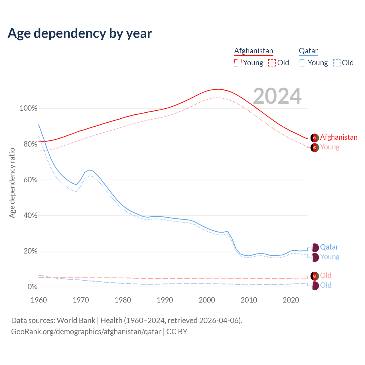 - Afghanistan is ranked 186/196 by median age (oldest to youngest) vs 78/196 for Qatar.