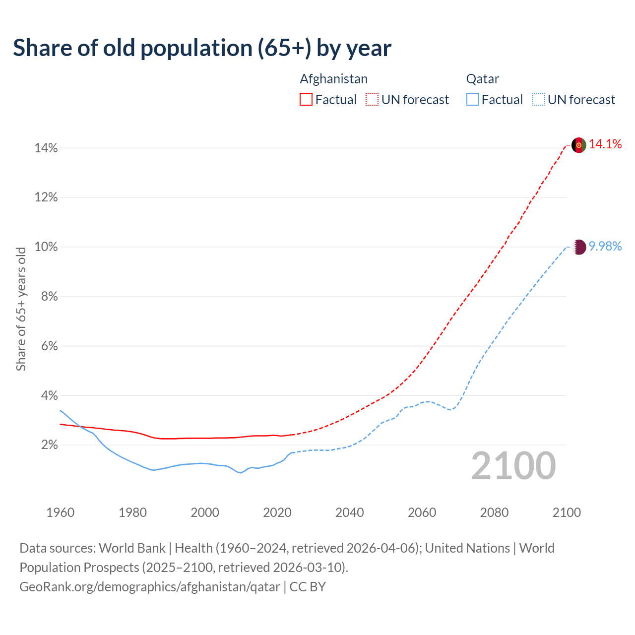 The share of older people aged 65 and over is 2.4% in Afghanistan and 1.68% in Qatar. Life expectancy in Afghanistan compared to Qatar .