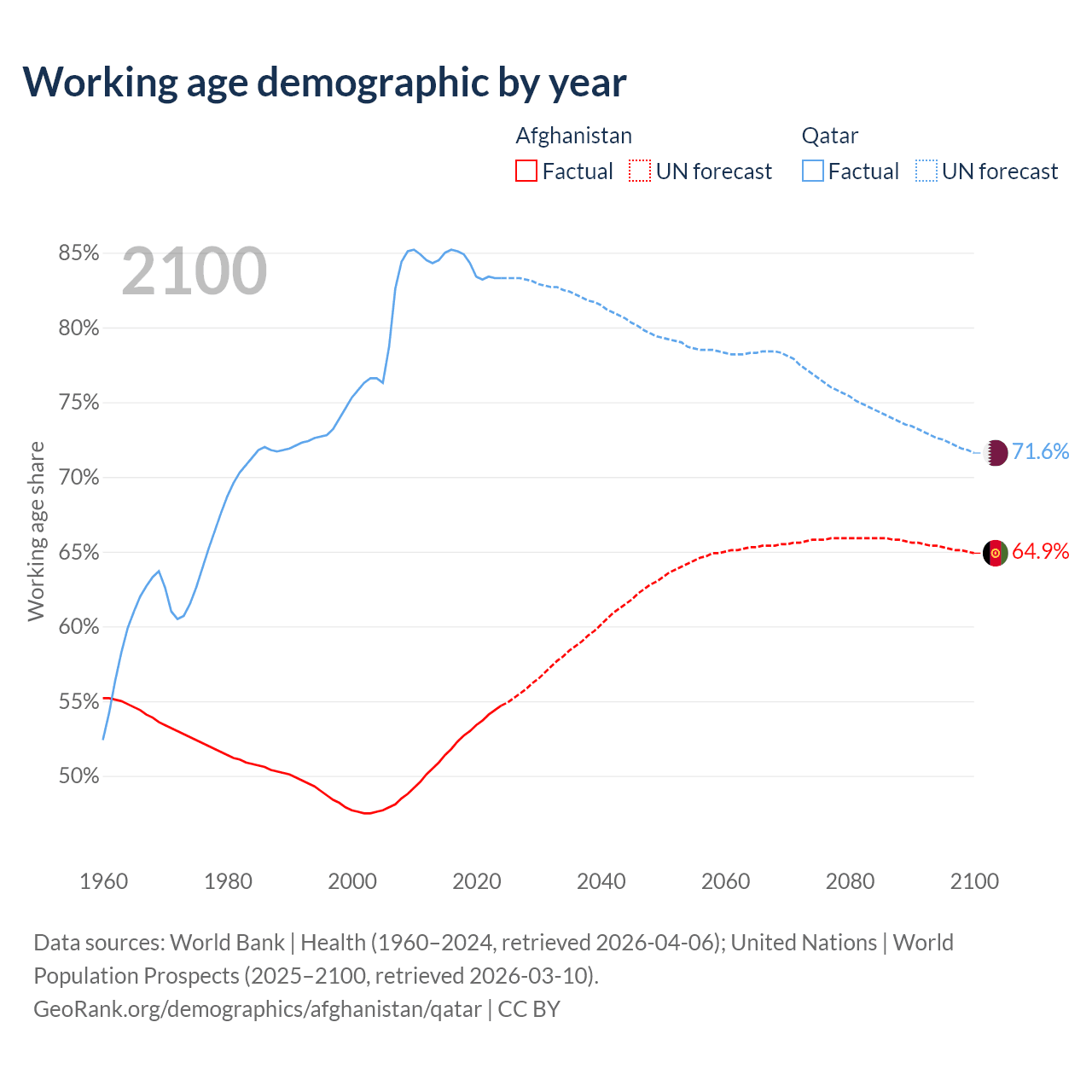 - Afghanistan has 24.8M working age adults (aged 15-64) vs 2.5M in Qatar.