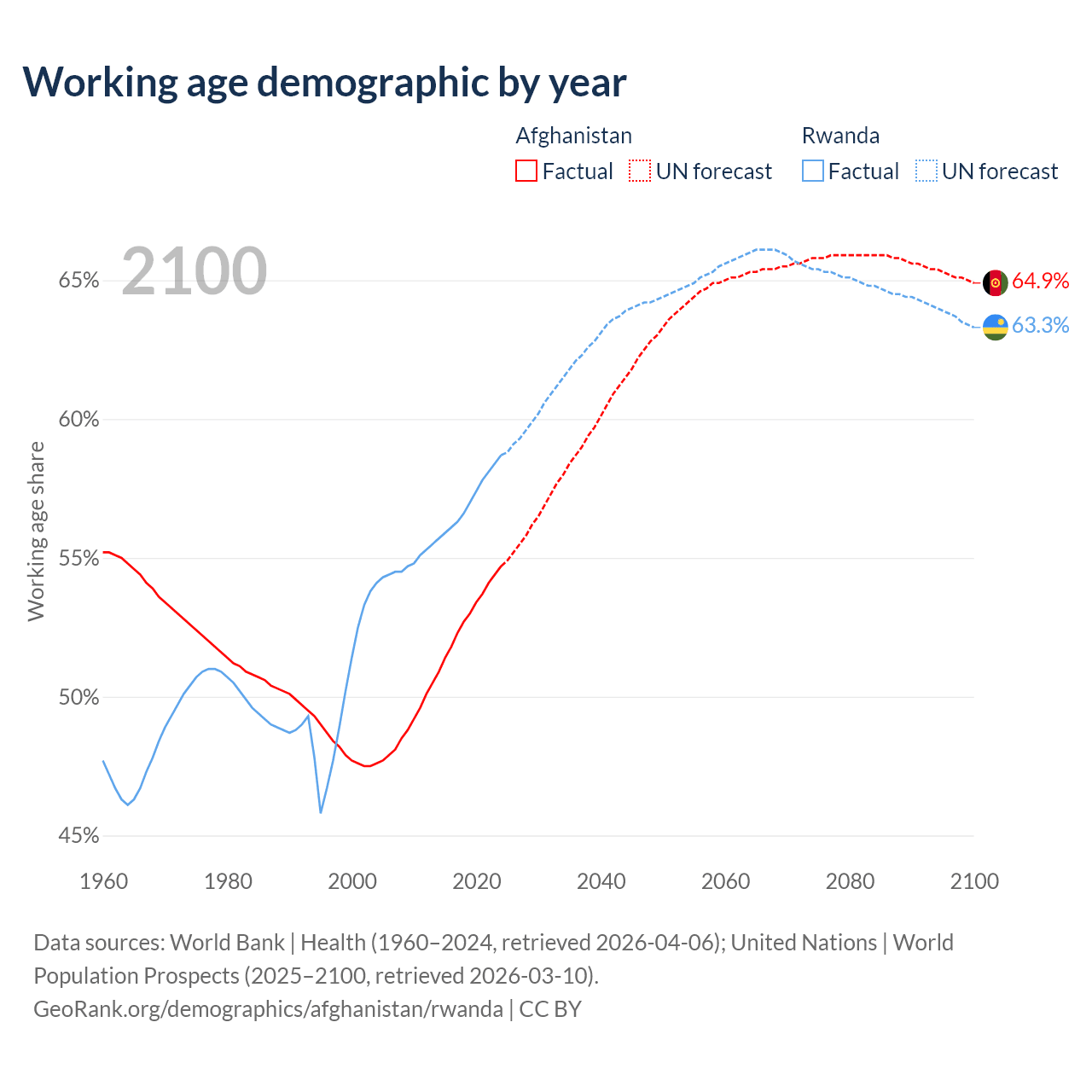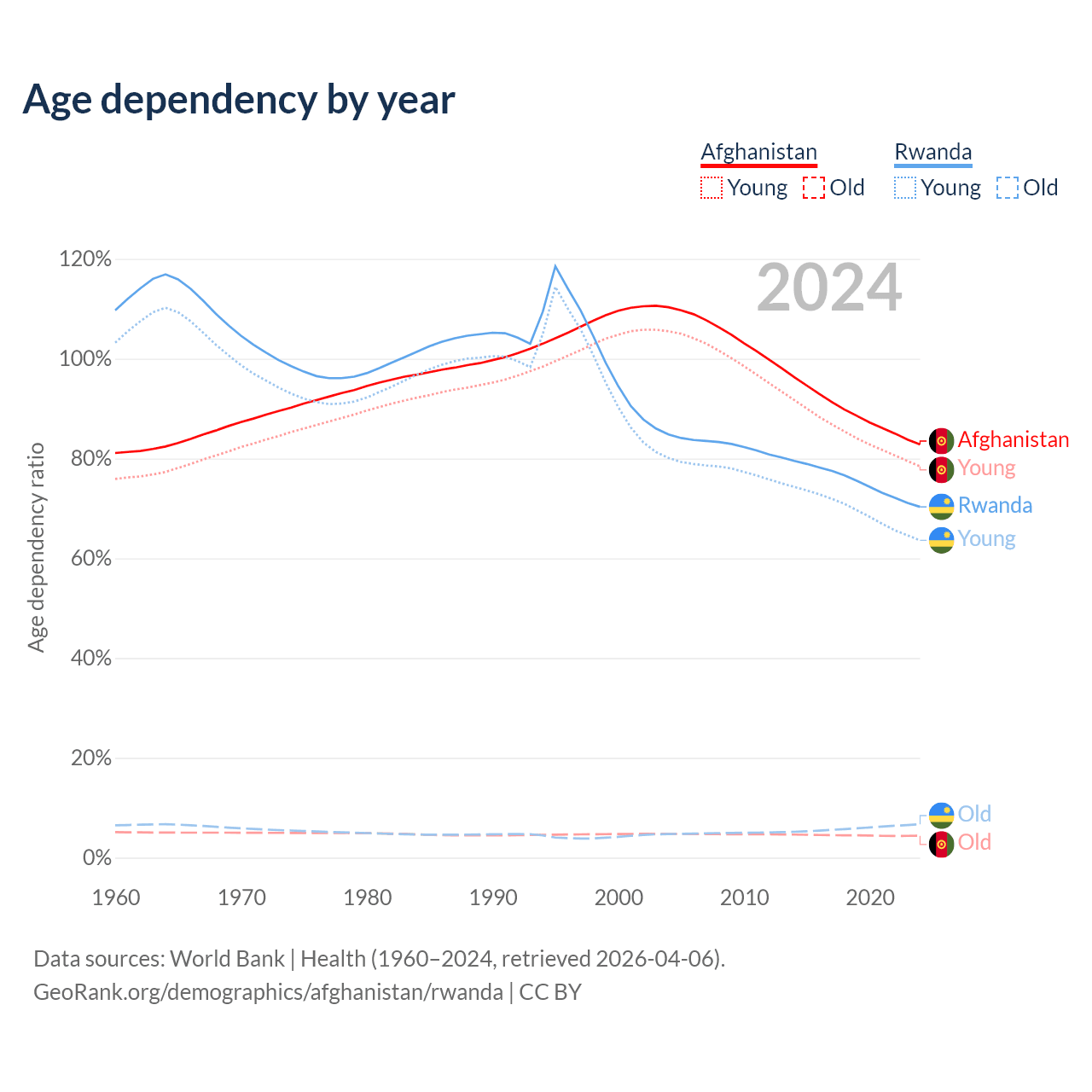 The share of older people aged 65 and over is 2.4% in Afghanistan and 3.93% in Rwanda. Life expectancy in Afghanistan compared to Rwanda .