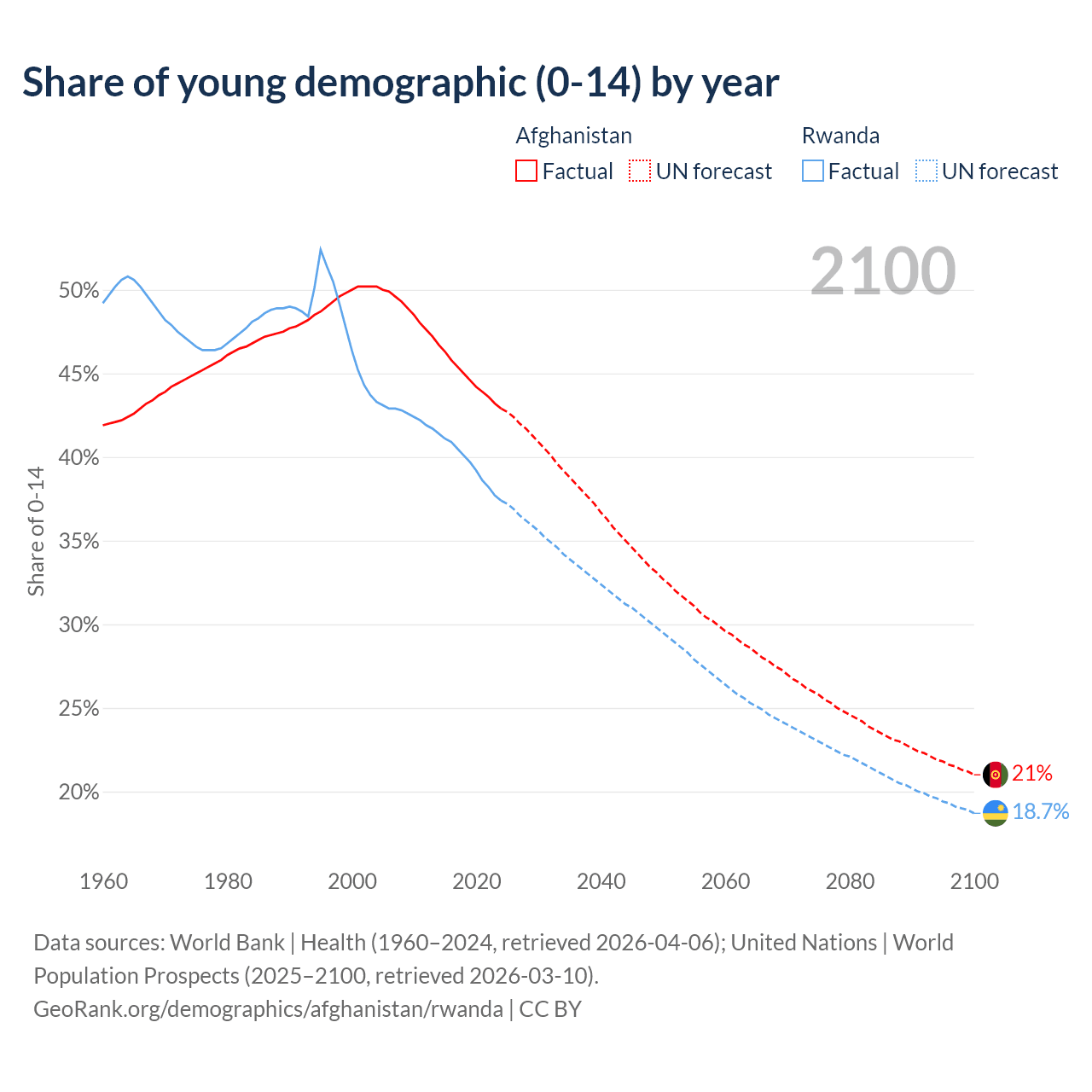 - The share of young demographic (0-15 years old) in Afghanistan is 42.9% vs 37.4% in Rwanda.