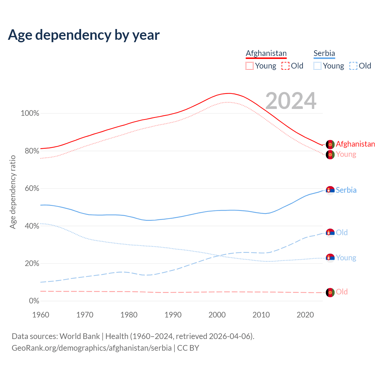 - Afghanistan is ranked 186/196 by median age (oldest to youngest) vs 15/196 for Serbia.