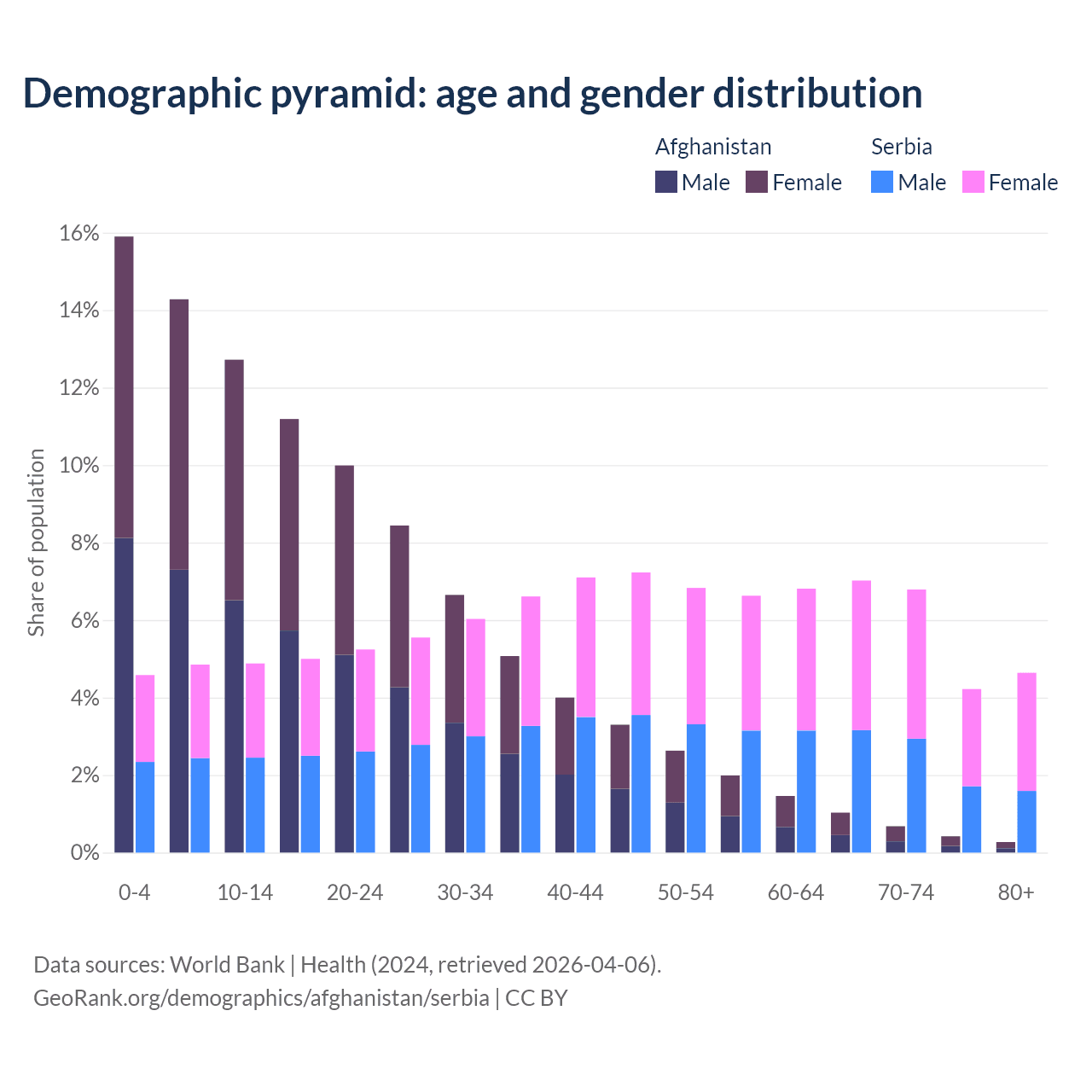 - As of 2026, the population of Afghanistan is 45.4M vs 6.49M in Serbia - 6.99 times difference.
