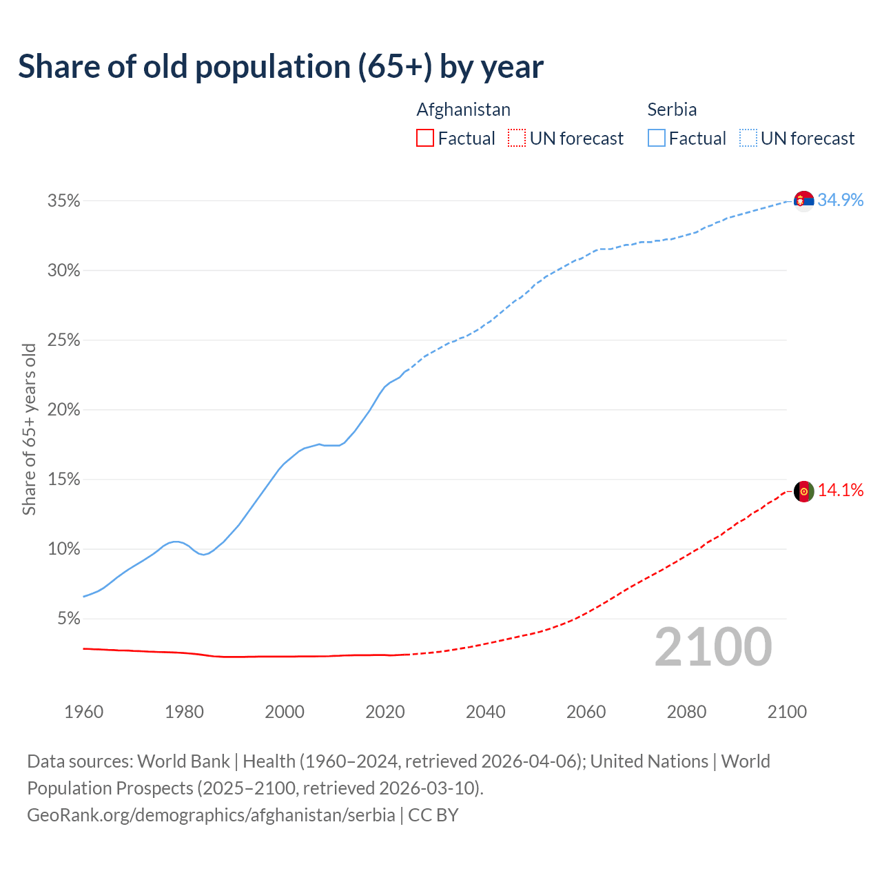 The share of older people aged 65 and over is 2.4% in Afghanistan and 22.7% in Serbia. Life expectancy in Afghanistan compared to Serbia .