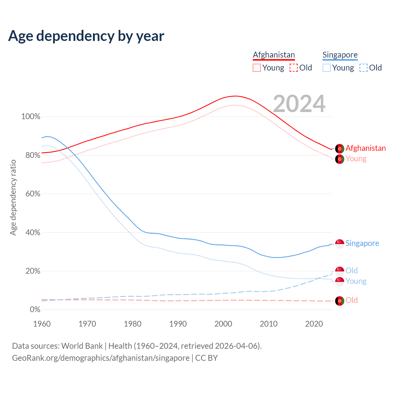 - Afghanistan is ranked 186/196 by median age (oldest to youngest) vs 68/196 for Singapore.