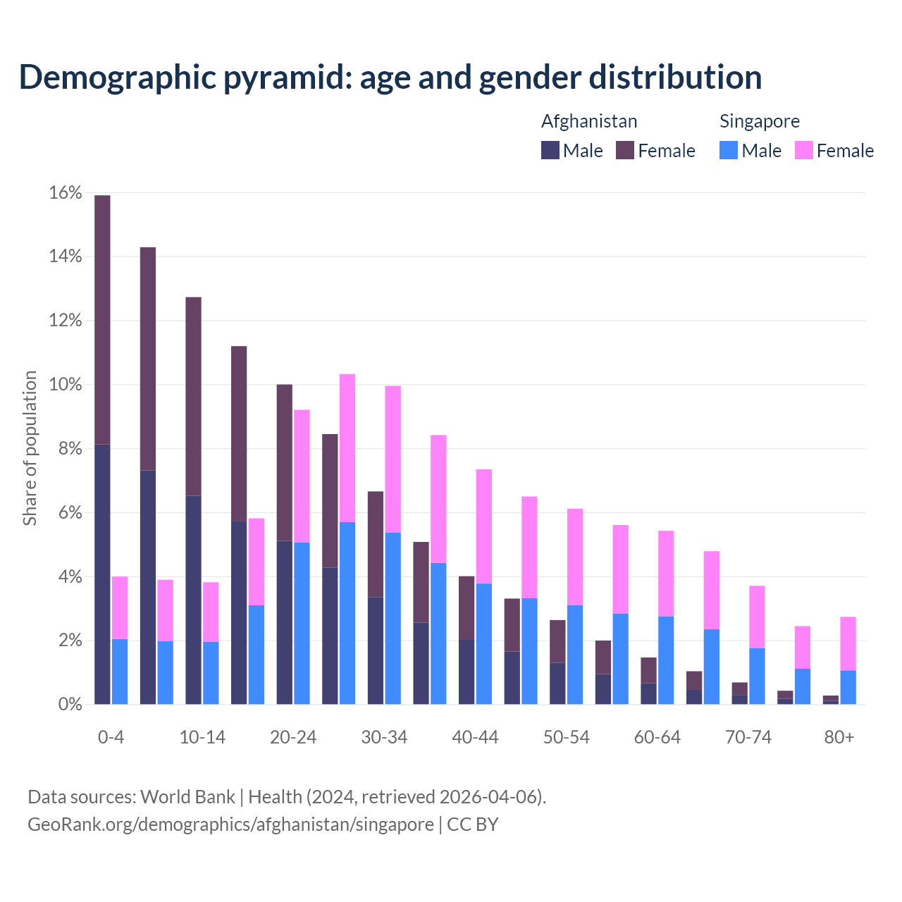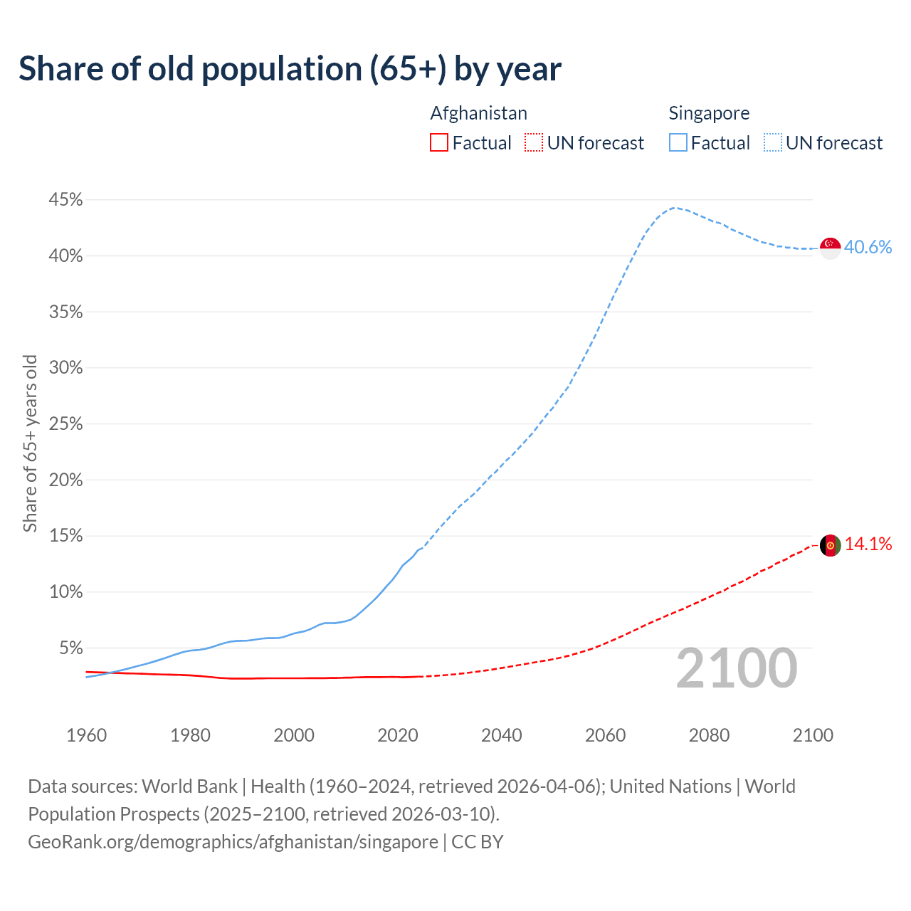The share of older people aged 65 and over is 2.4% in Afghanistan and 13.7% in Singapore. Life expectancy in Afghanistan compared to Singapore .