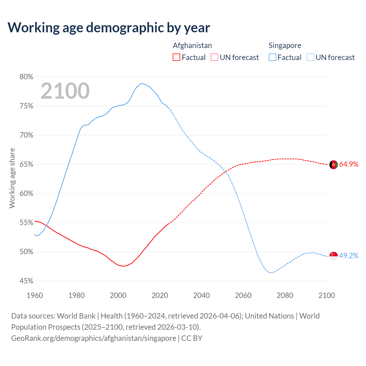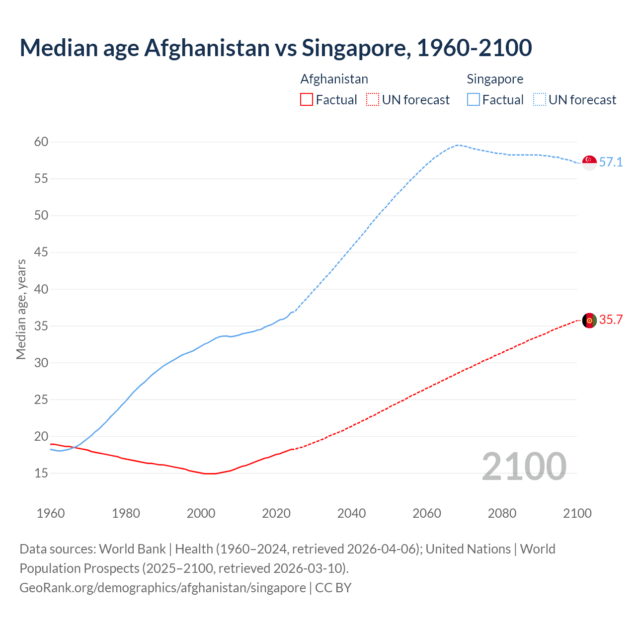 Median age Afghanistan vs Singapore, 1960-2100