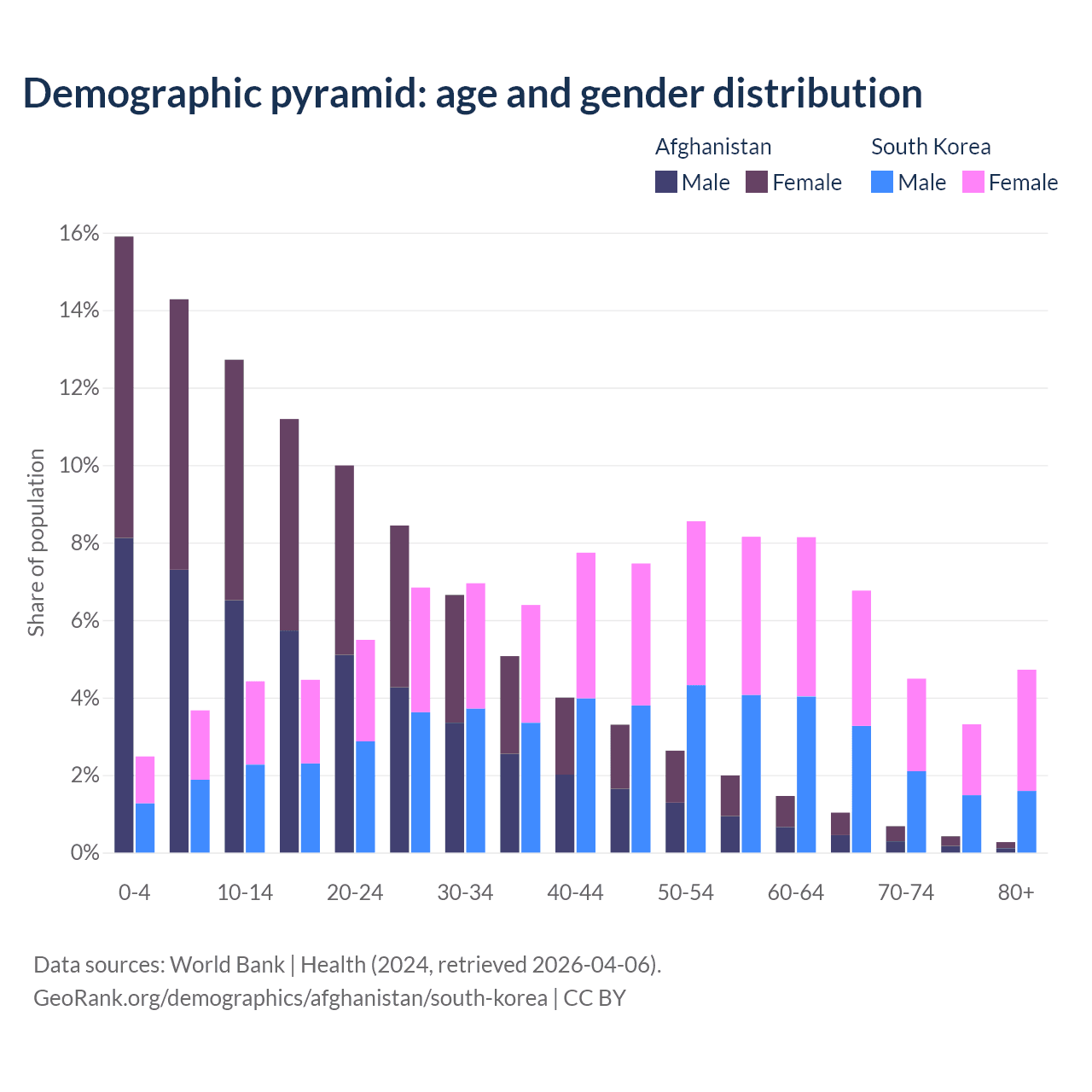 The share of older people aged 65 and over is 2.4% in Afghanistan and 19.3% in South Korea. Life expectancy in Afghanistan compared to South Korea .