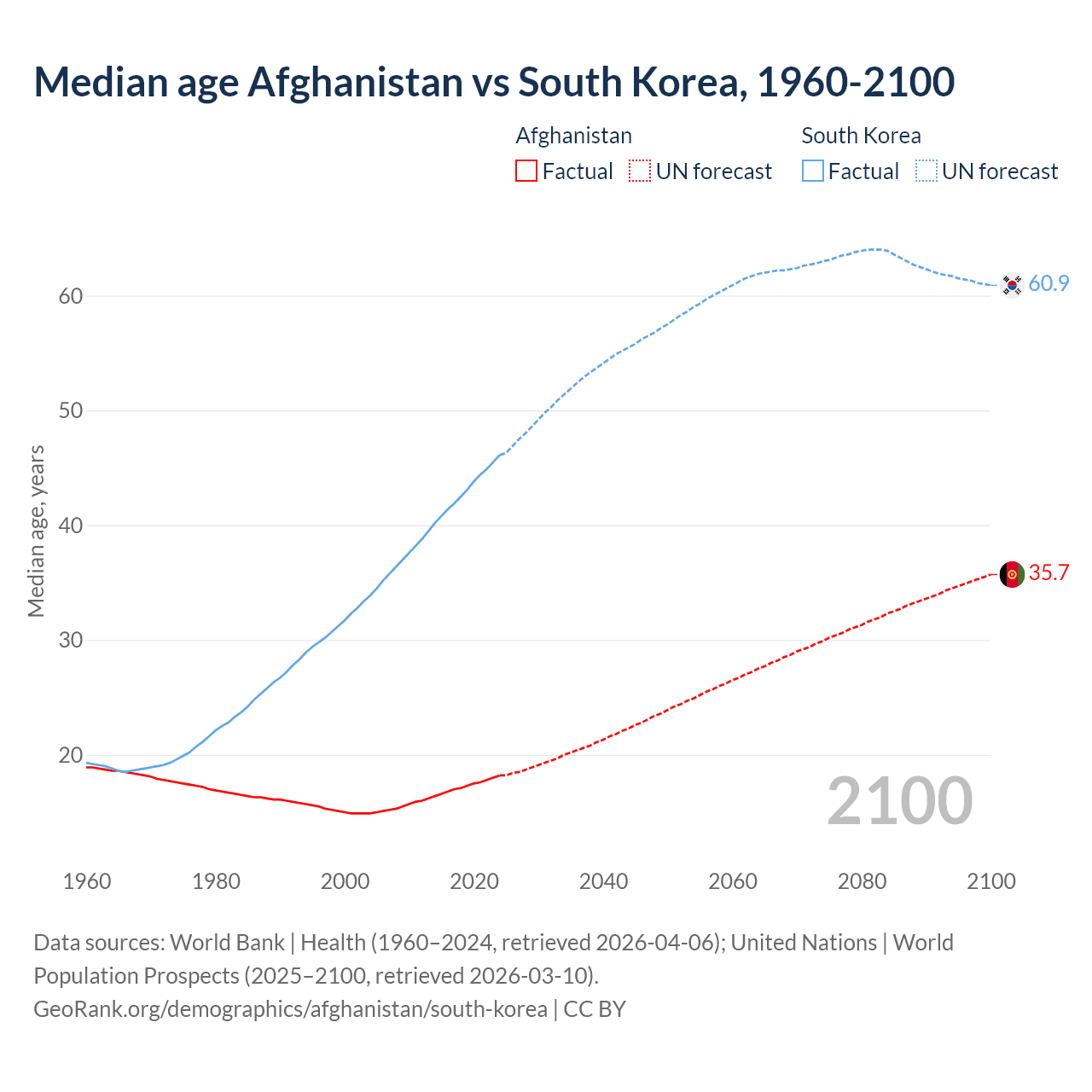 Median age Afghanistan vs South Korea, 1960-2100