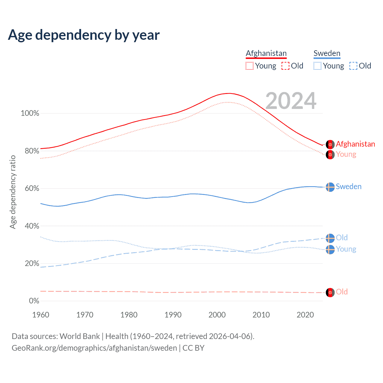 - The share of old-age demographic (65+) in Afghanistan is 2.4% vs 20.7% in Sweden.