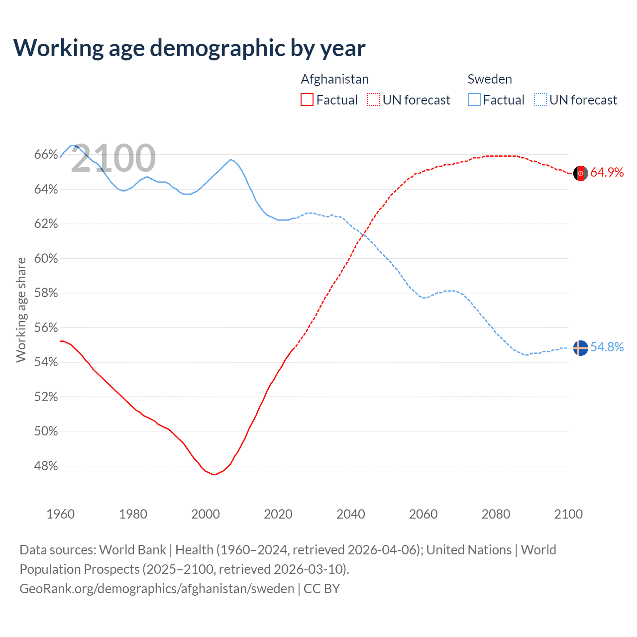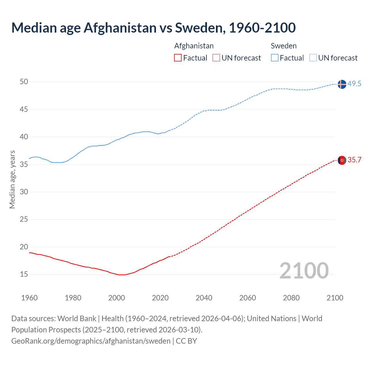 Median age Afghanistan vs Sweden, 1960-2100