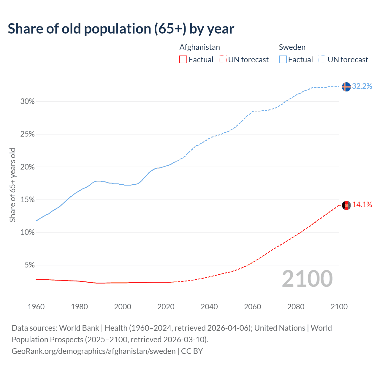 The share of older people aged 65 and over is 2.4% in Afghanistan and 20.7% in Sweden. Life expectancy in Afghanistan compared to Sweden .