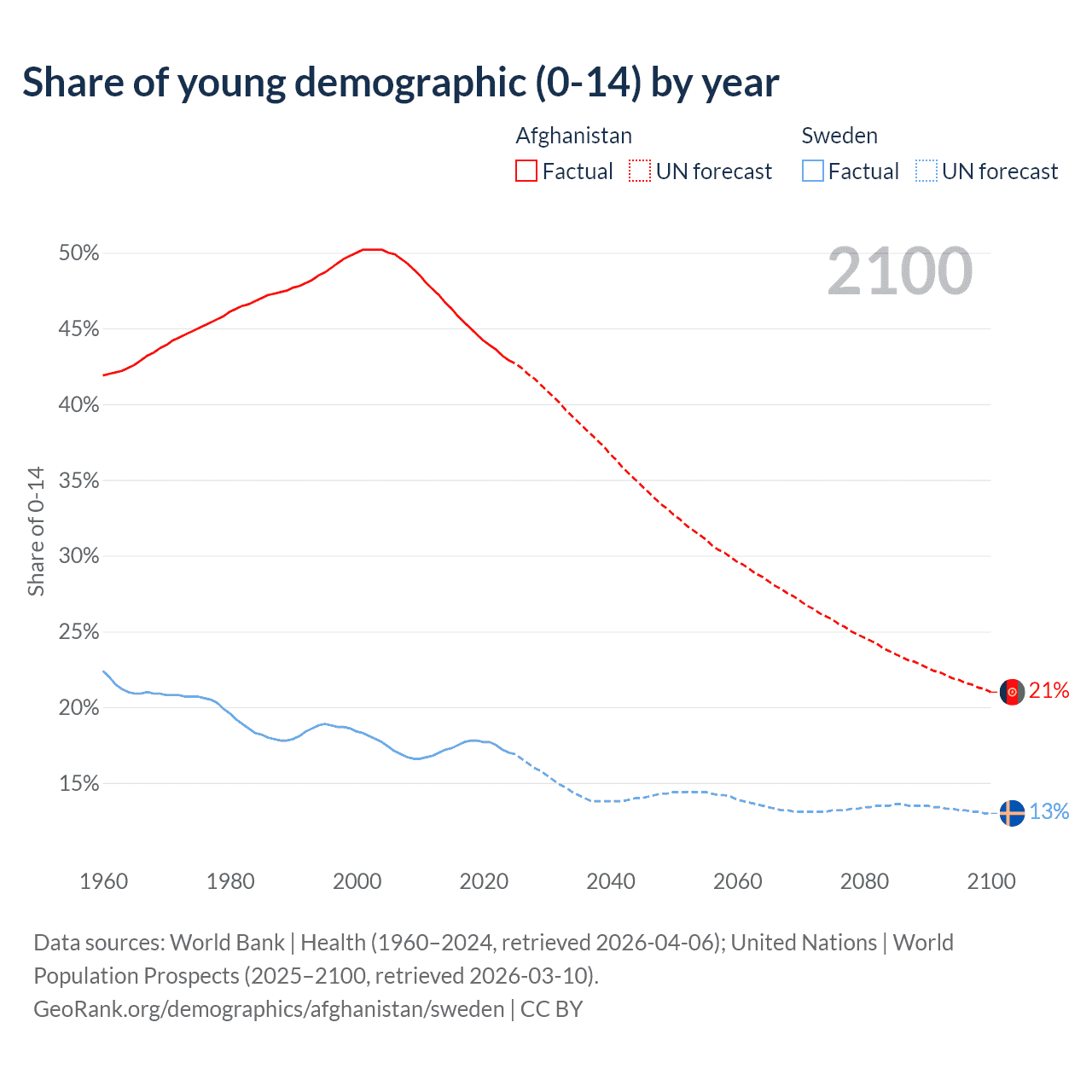 - The share of young demographic (0-15 years old) in Afghanistan is 42.9% vs 17% in Sweden.