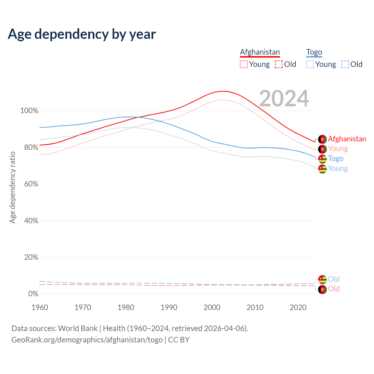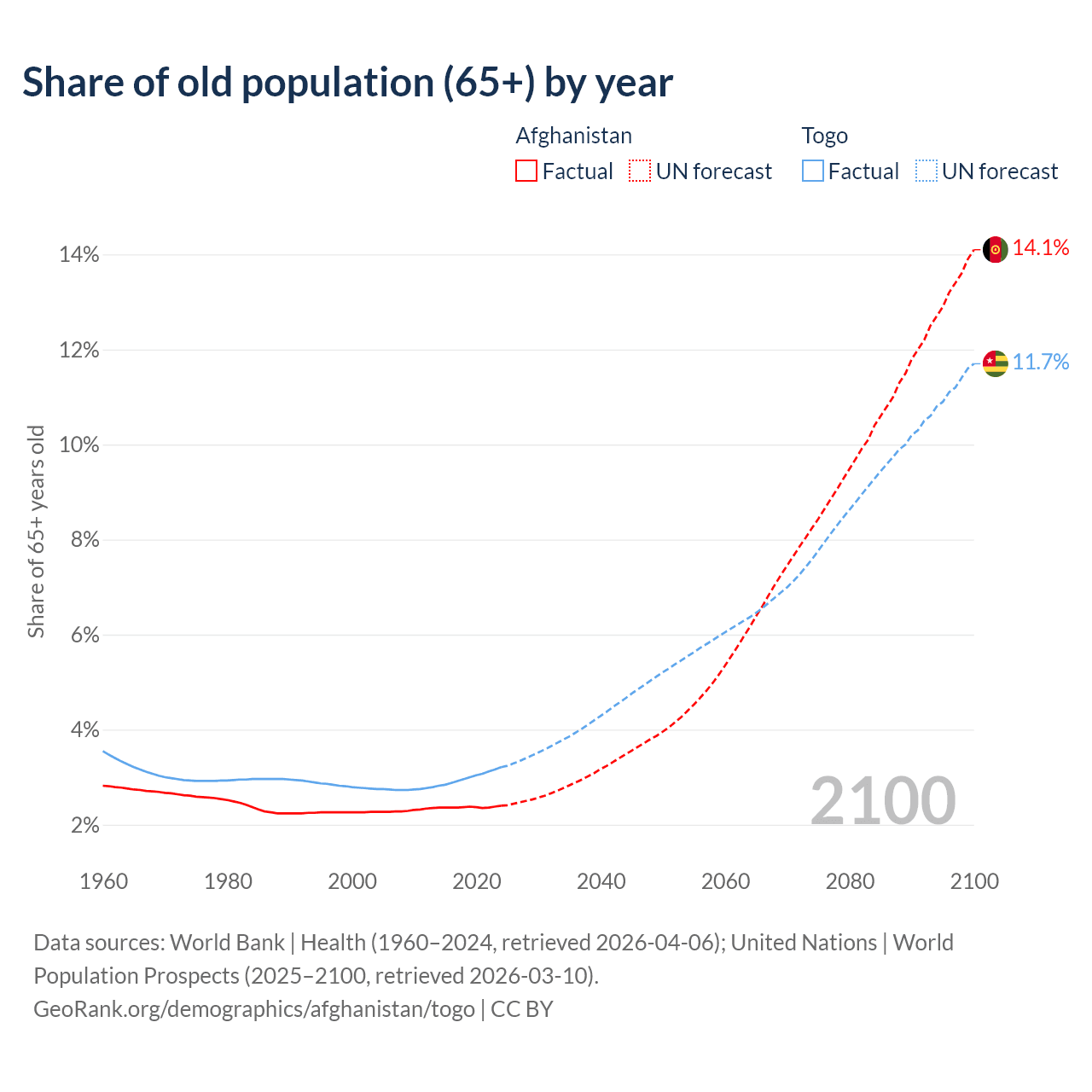 - The share of old-age demographic (65+) in Afghanistan is 2.4% vs 3.21% in Togo.