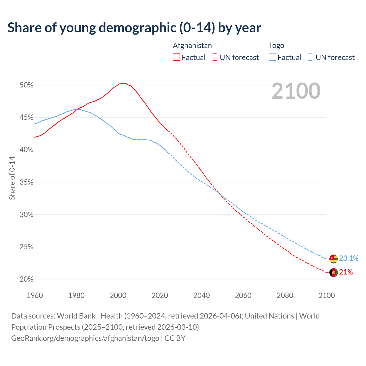 - The share of young demographic (0-15 years old) in Afghanistan is 42.9% vs 39.5% in Togo.
