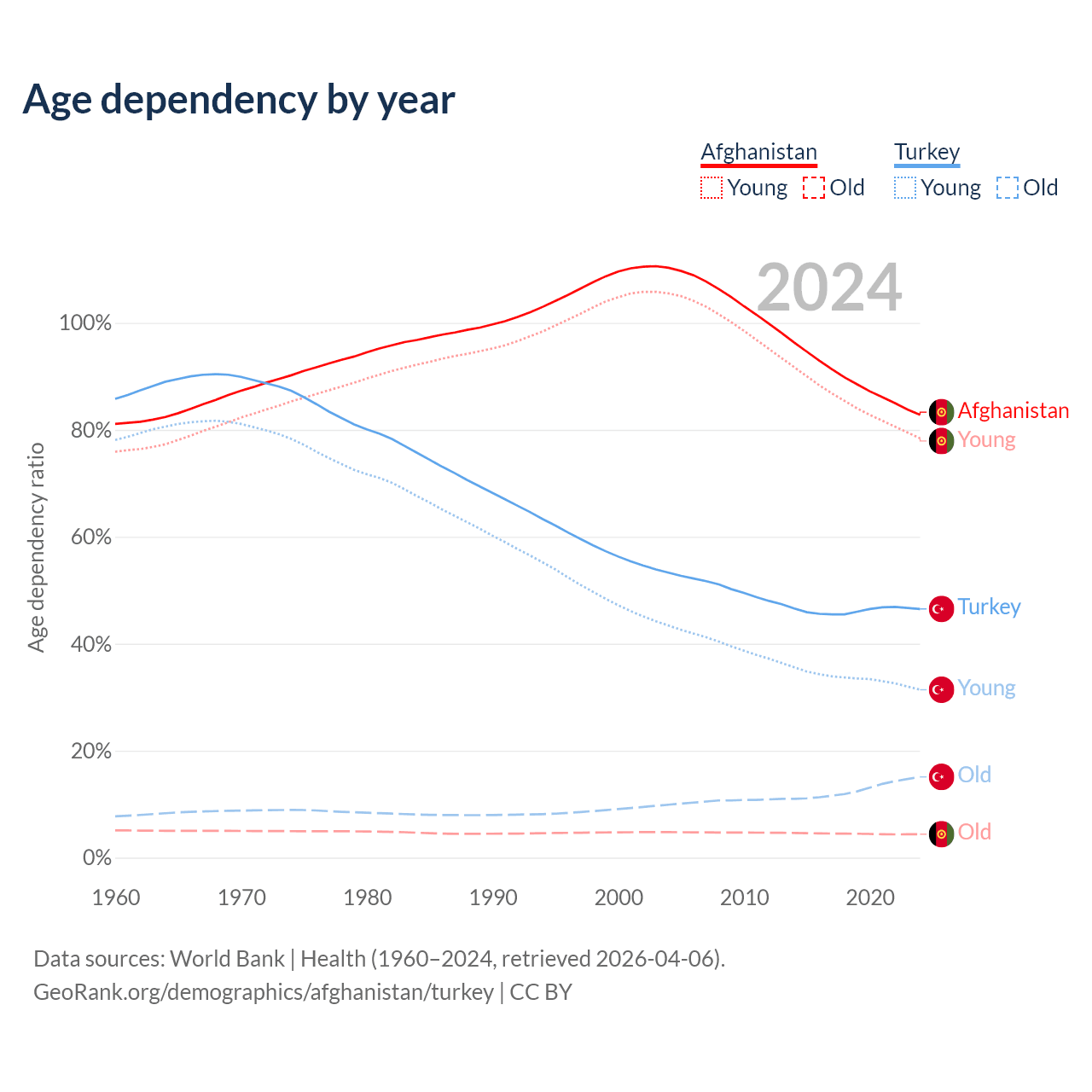 - Afghanistan is ranked 186/196 by median age (oldest to youngest) vs 83/196 for Turkey.