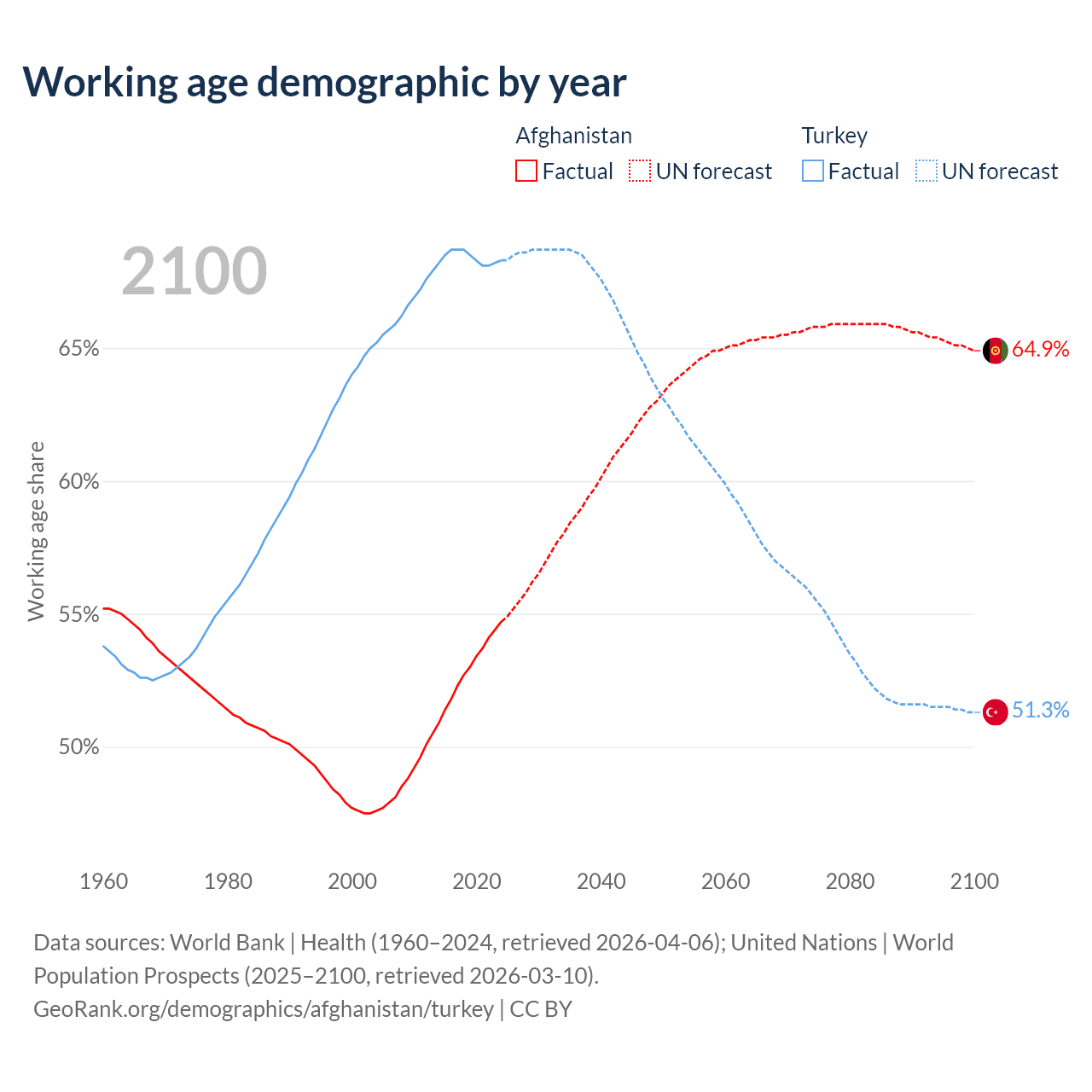 - Afghanistan has 24.8M working age adults (aged 15-64) vs 58.7M in Turkey.