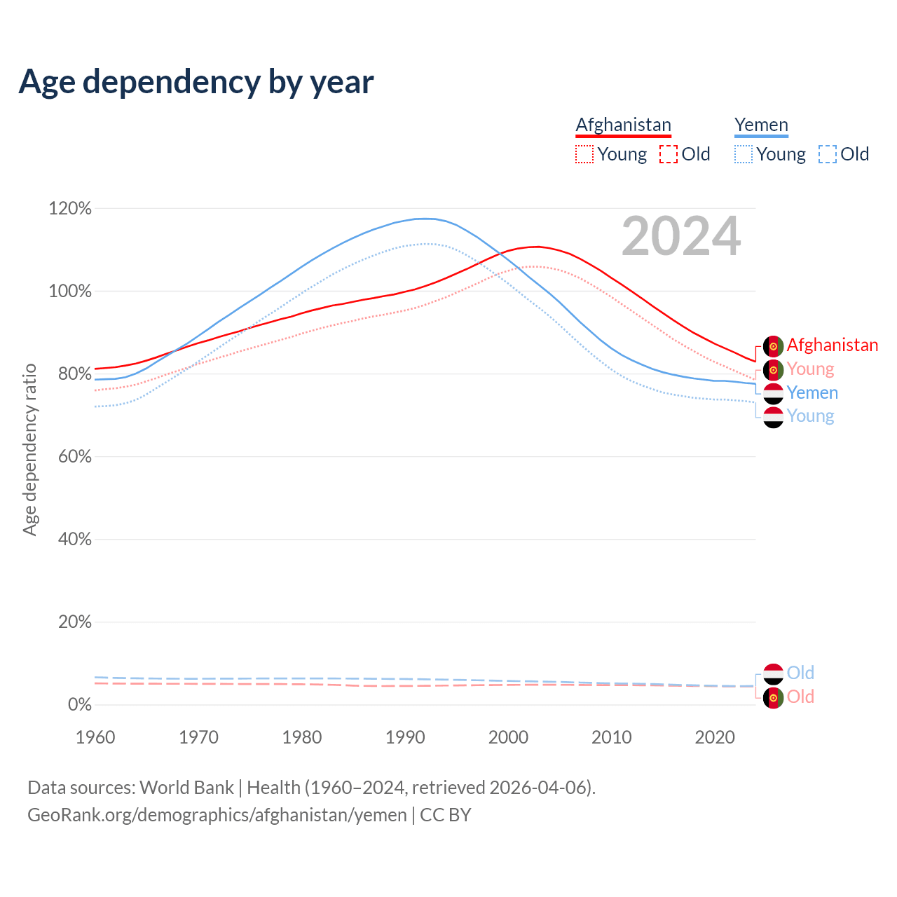 - The share of old-age demographic (65+) in Afghanistan is 2.4% vs 2.52% in Yemen.
