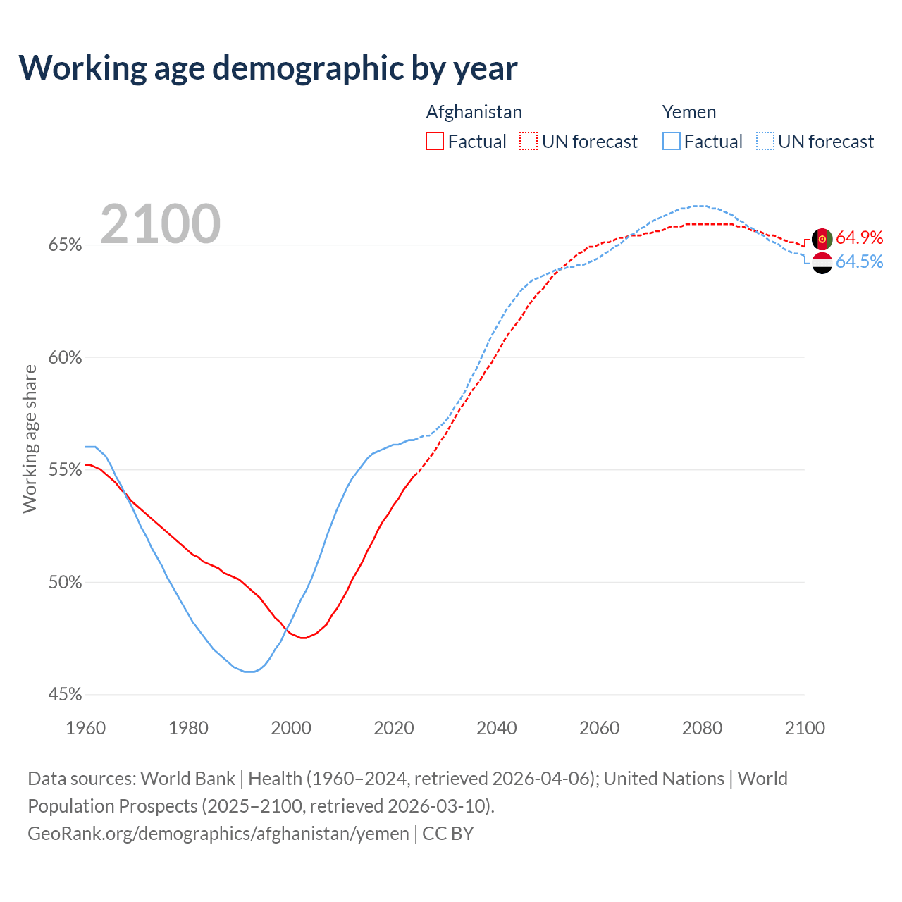 - Afghanistan has 24.8M working age adults (aged 15-64) vs 24.4M in Yemen.