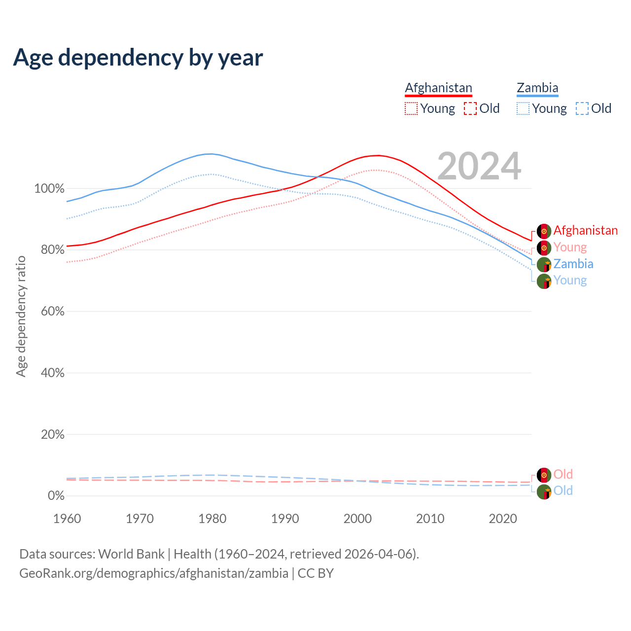 - The share of old-age demographic (65+) in Afghanistan is 2.4% vs 1.95% in Zambia.