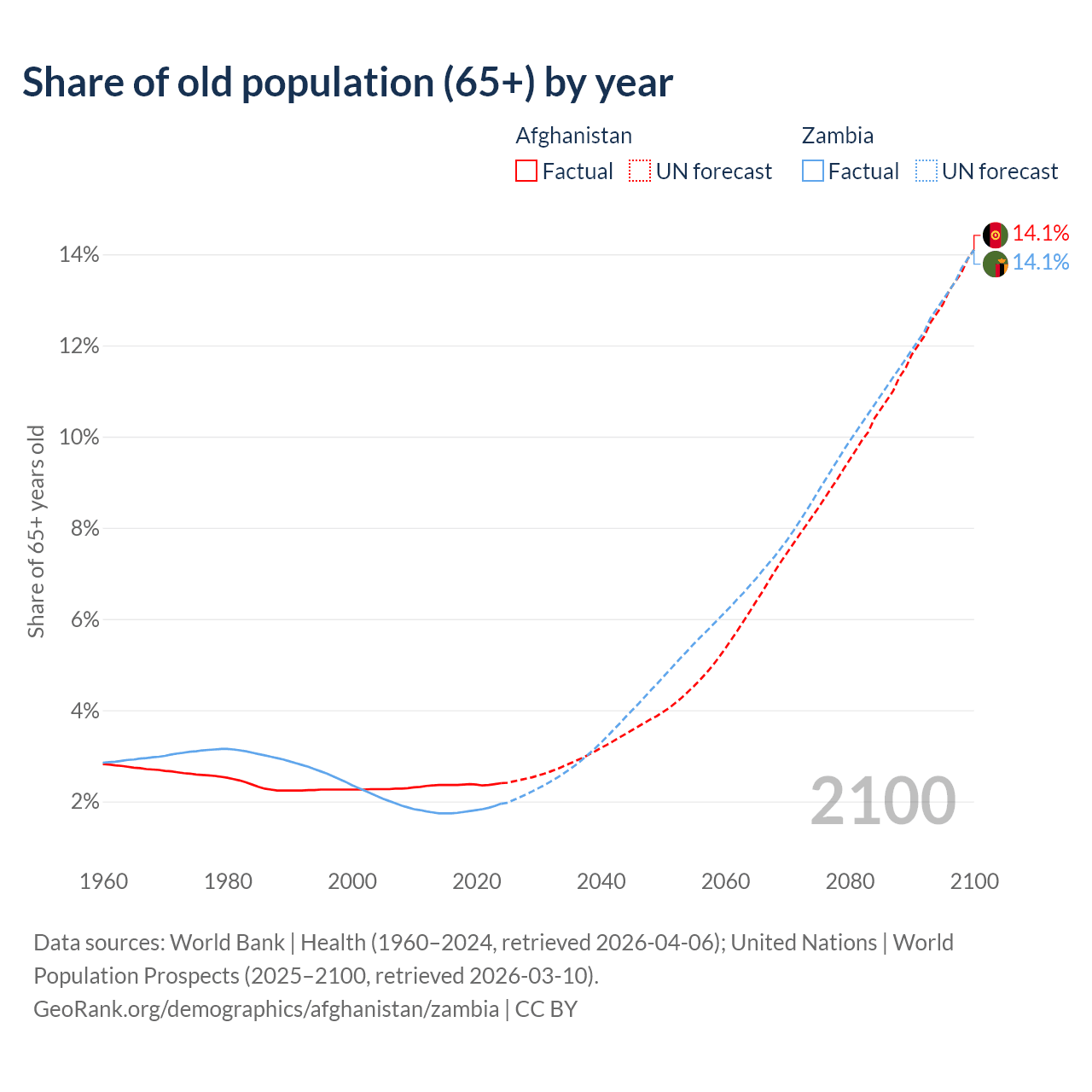 The share of older people aged 65 and over is 2.4% in Afghanistan and 1.95% in Zambia. Life expectancy in Afghanistan compared to Zambia .
