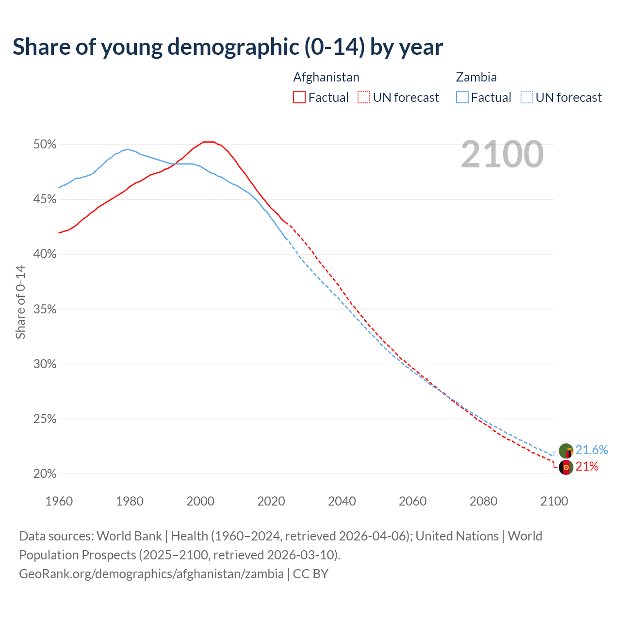 - As of 2026, the population of Afghanistan is 45.4M vs 22.7M in Zambia - 2 times difference.
