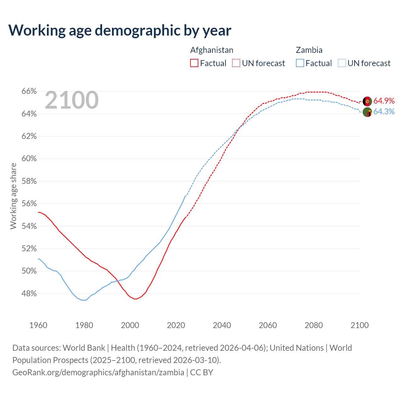 - Afghanistan has 24.8M working age adults (aged 15-64) vs 12.8M in Zambia.