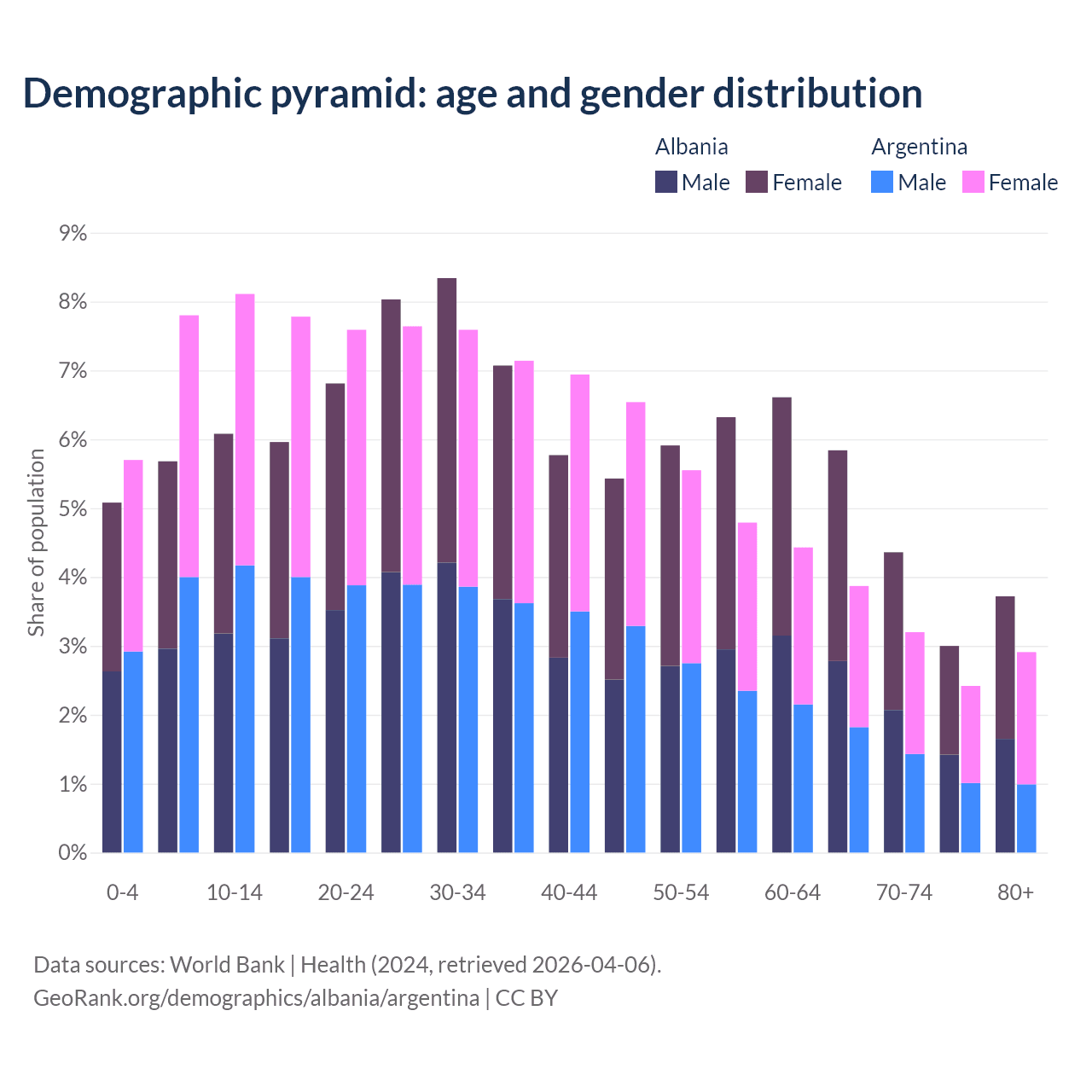 - Albania is ranked 60/196 by median age (oldest to youngest) vs 85/196 for Argentina.