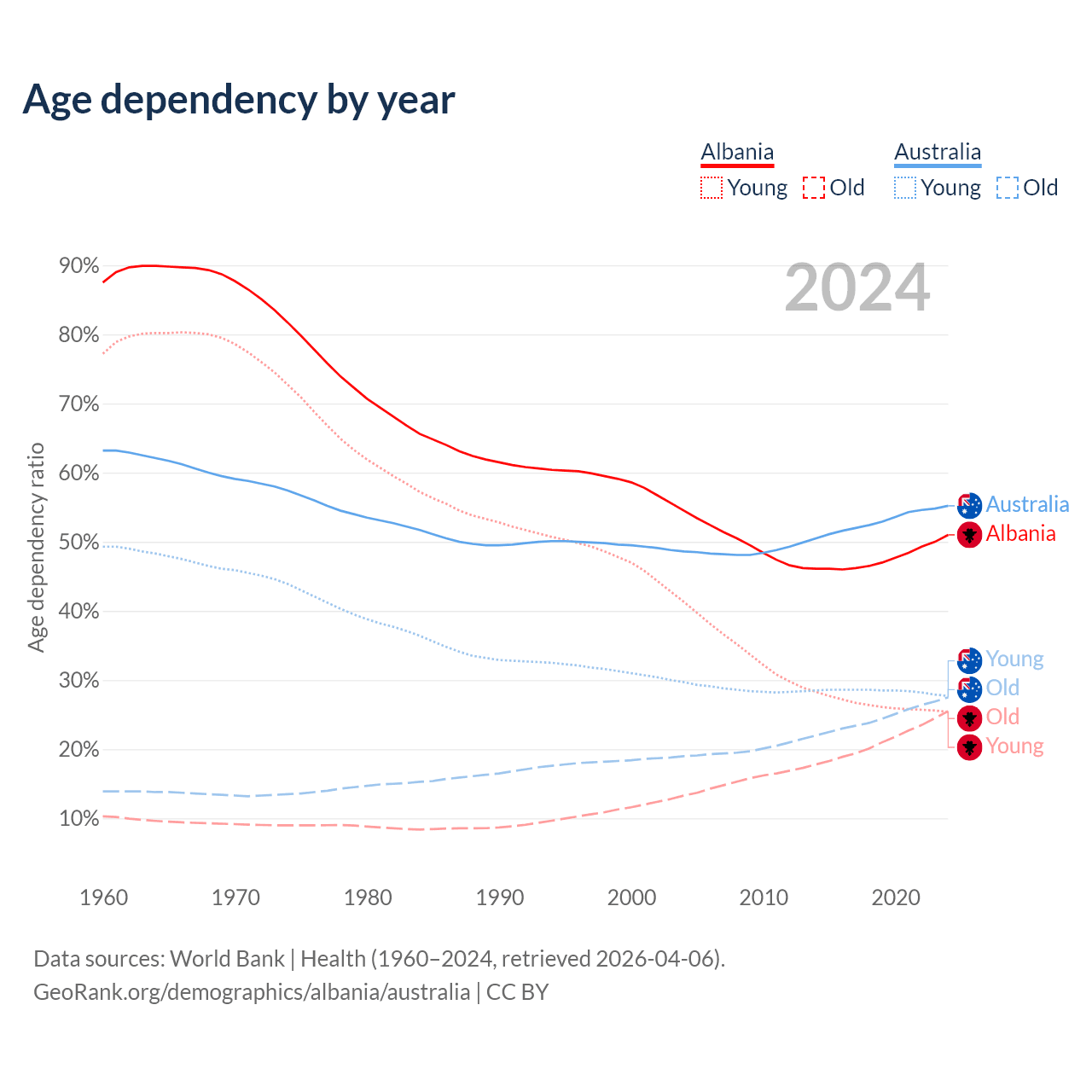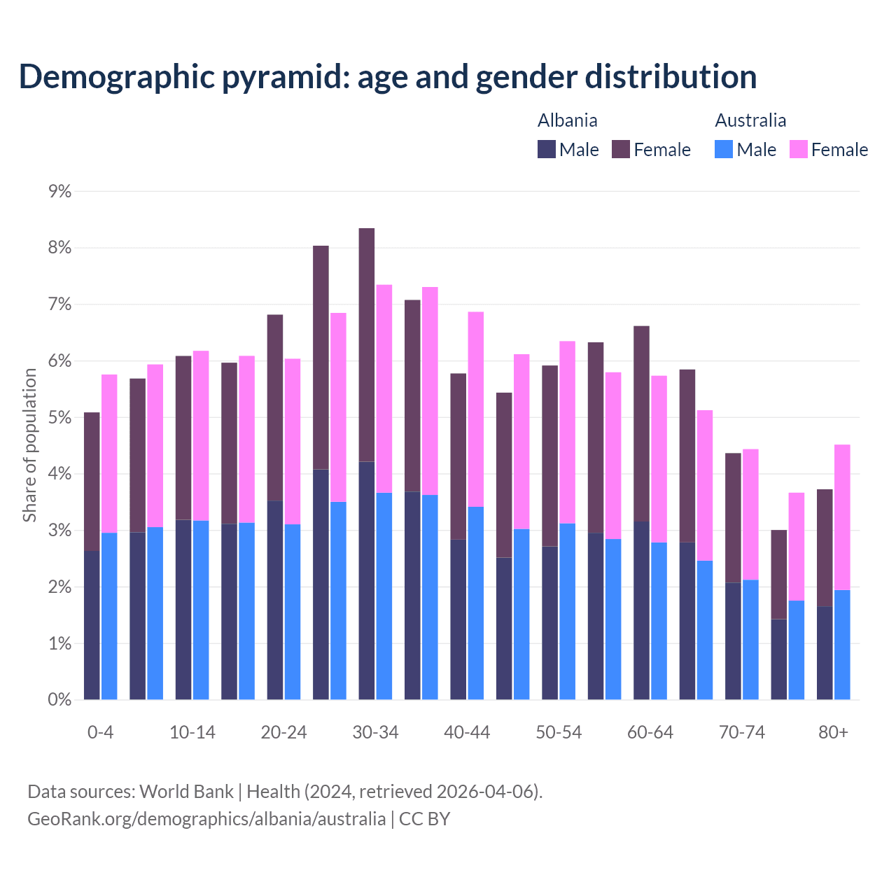 - Albania is ranked 60/196 by median age (oldest to youngest) vs 55/196 for Australia.