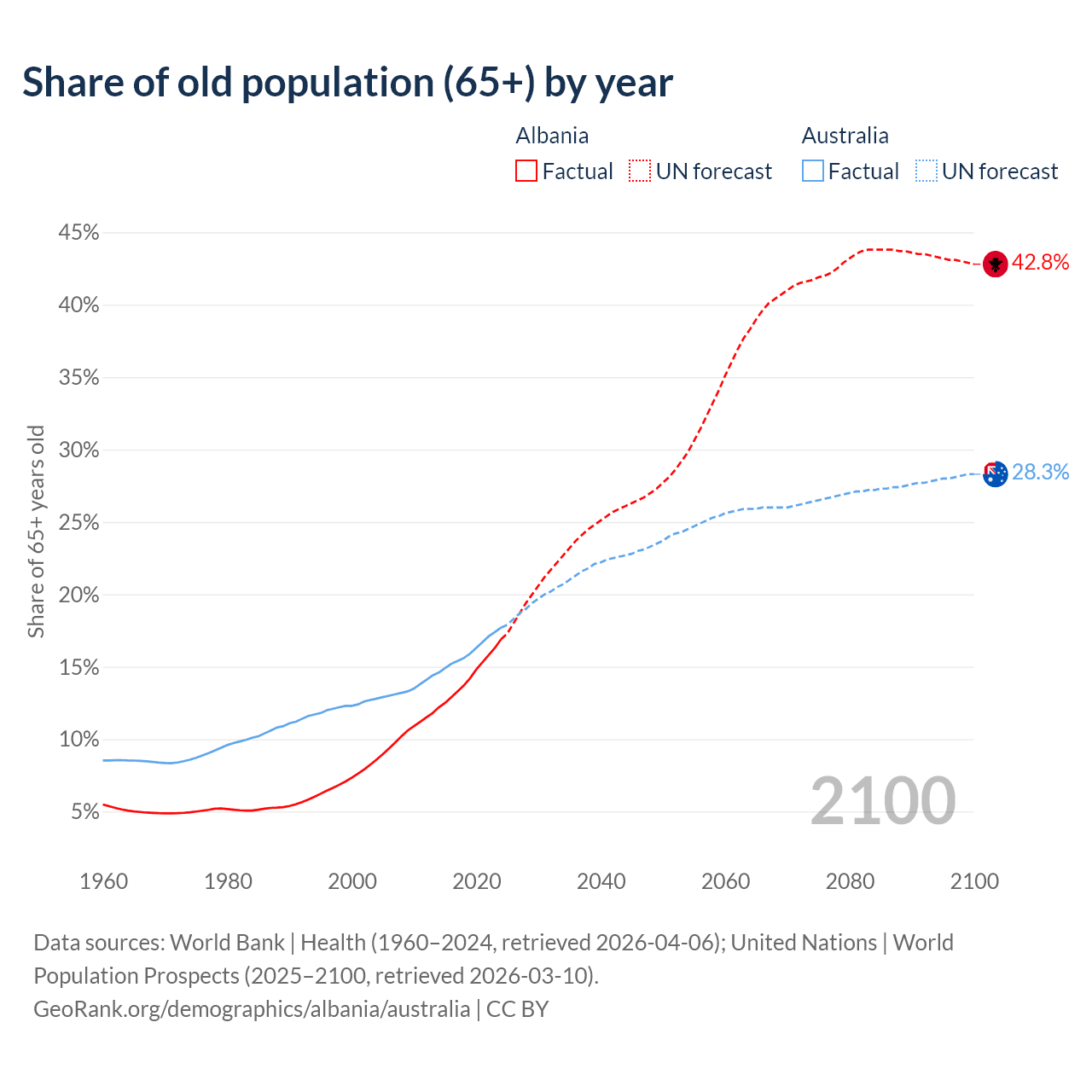 The share of older people aged 65 and over is 16.9% in Albania and 17.7% in Australia. Life expectancy in Albania compared to Australia .