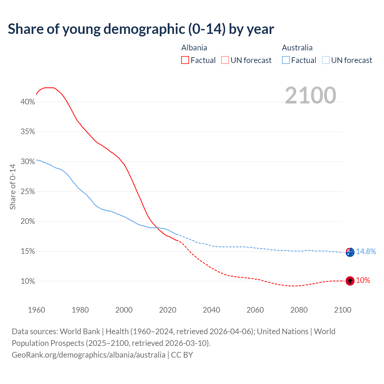 - The share of young demographic (0-15 years old) in Albania is 16.8% vs 17.8% in Australia.