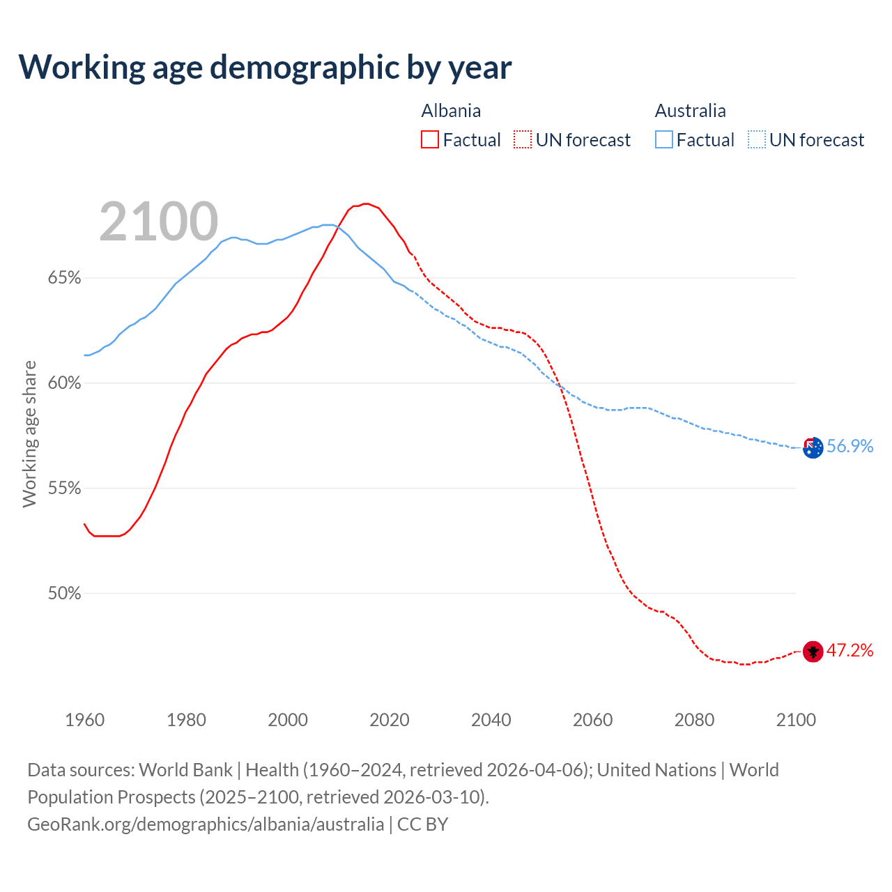- The share of old-age demographic (65+) in Albania is 16.9% vs 17.7% in Australia.