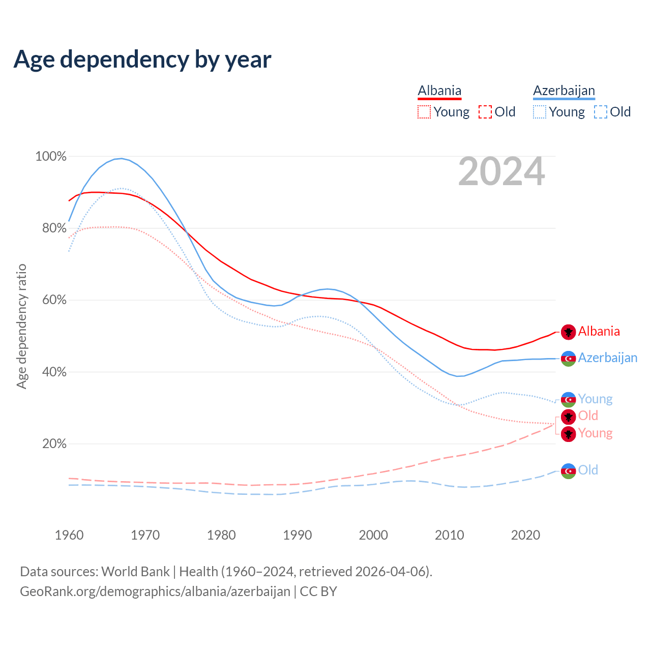 Data sources: World Bank | Health (1960–2024, retrieved 2026-04-06); U.S. Census Bureau (1960–2024, retrieved 2026-02-08).