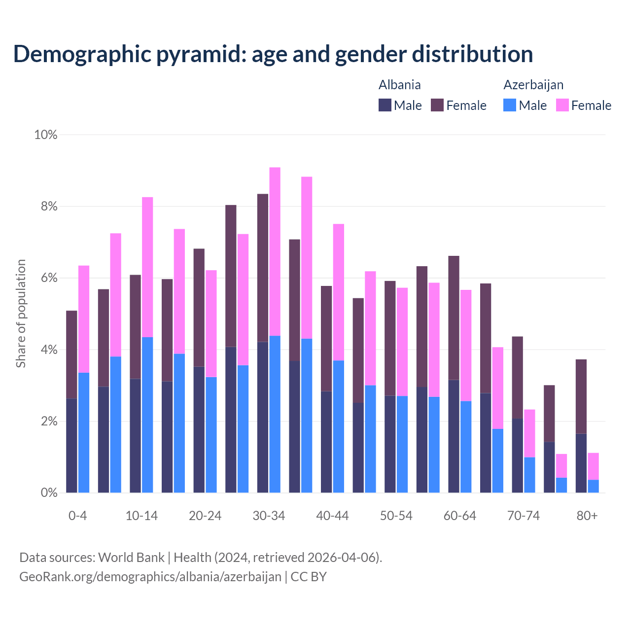 - Albania is ranked 60/196 by median age (oldest to youngest) vs 82/196 for Azerbaijan.