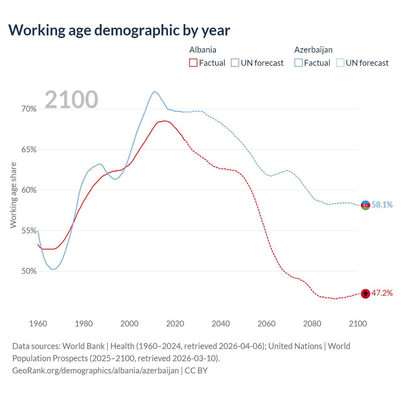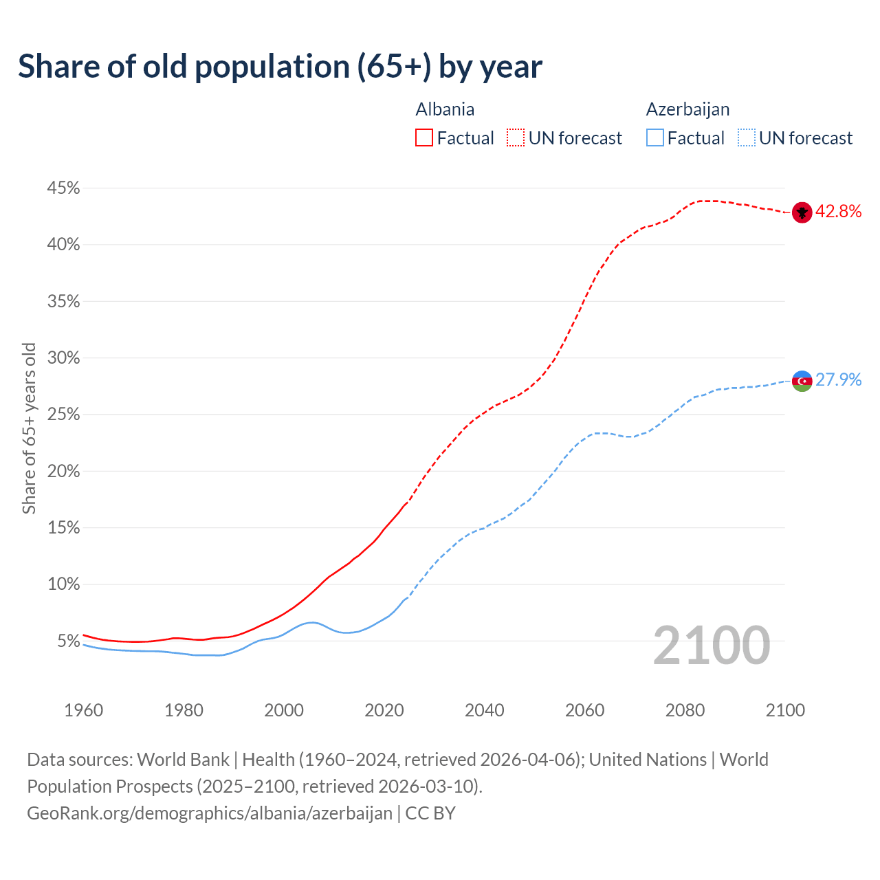 Median age Albania vs Azerbaijan, 1960-2100