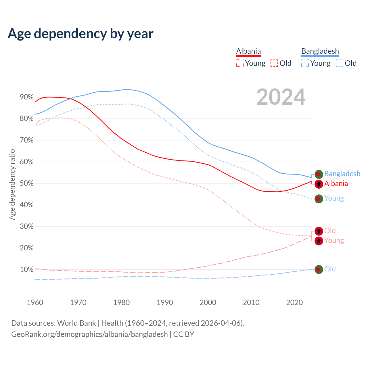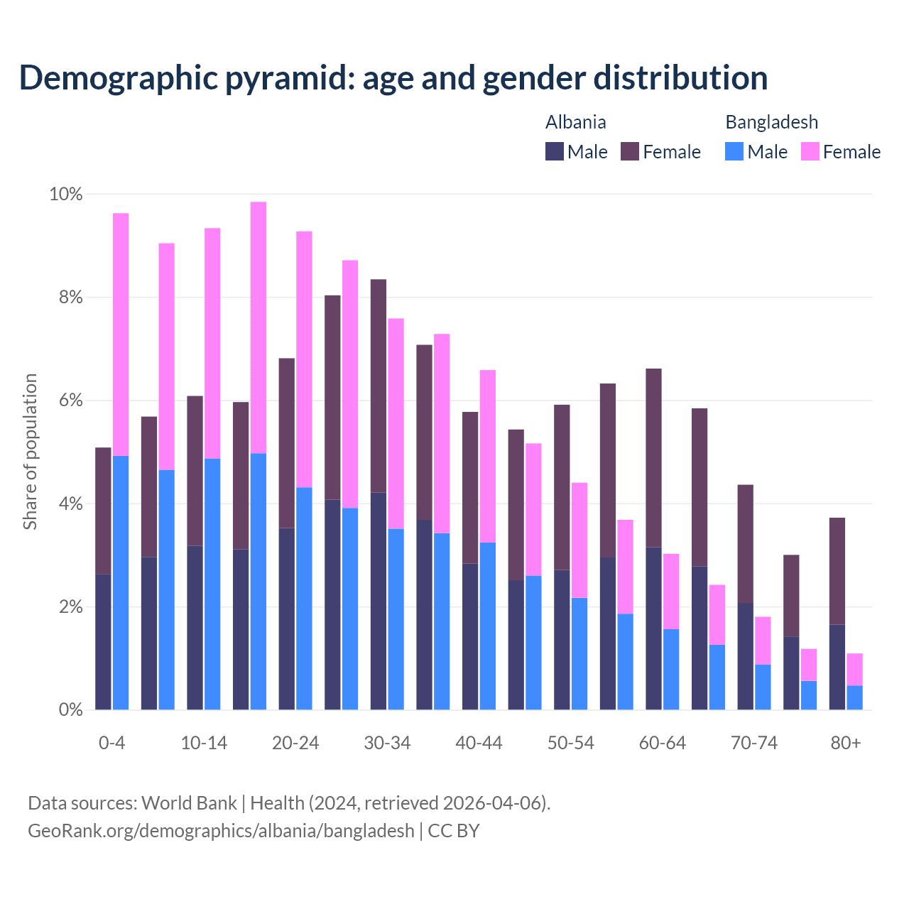 - Albania is ranked 60/196 by median age (oldest to youngest) vs 124/196 for Bangladesh.