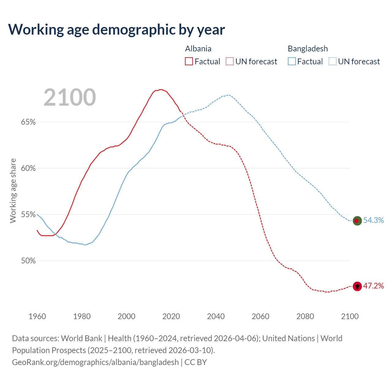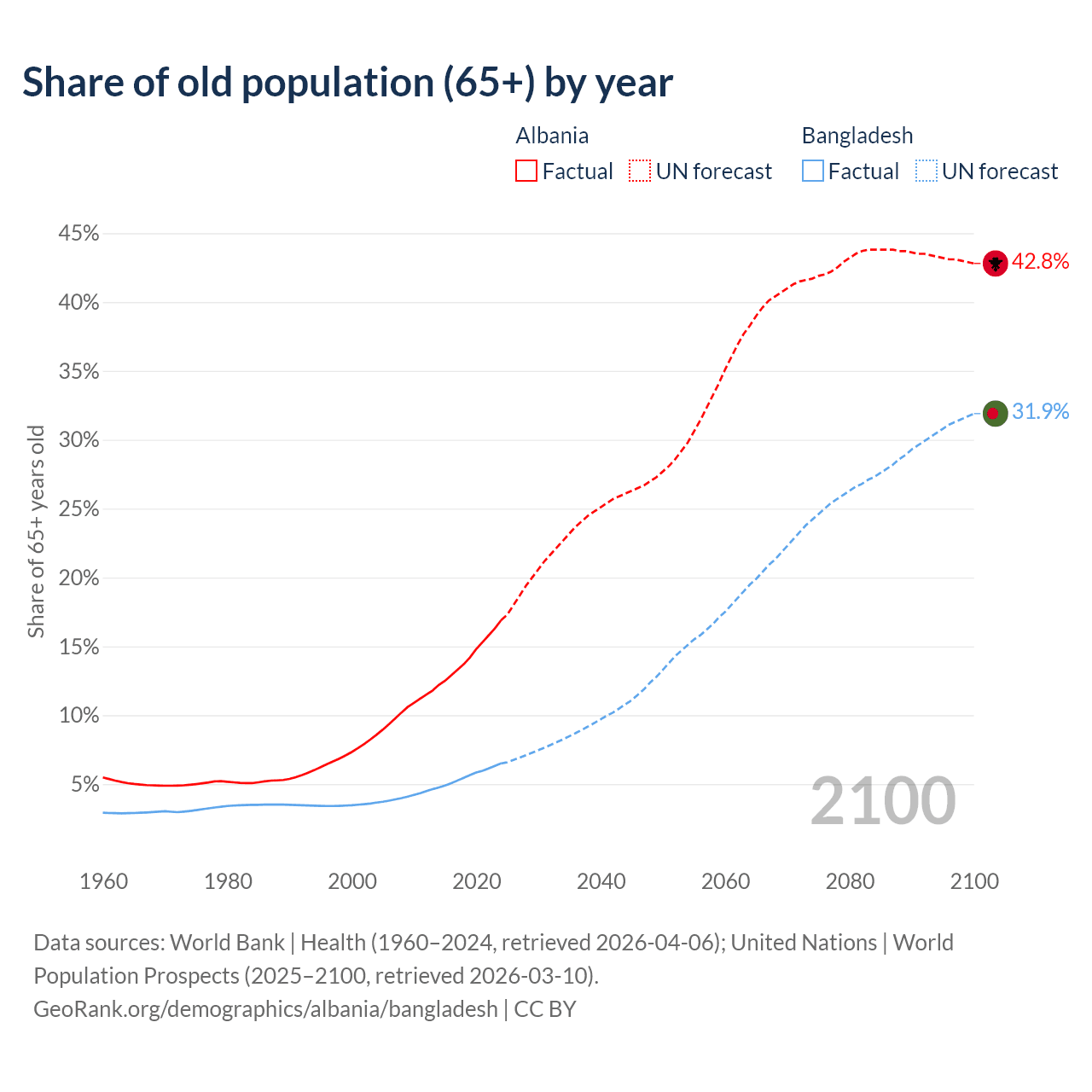 - The share of old-age demographic (65+) in Albania is 16.9% vs 6.5% in Bangladesh.