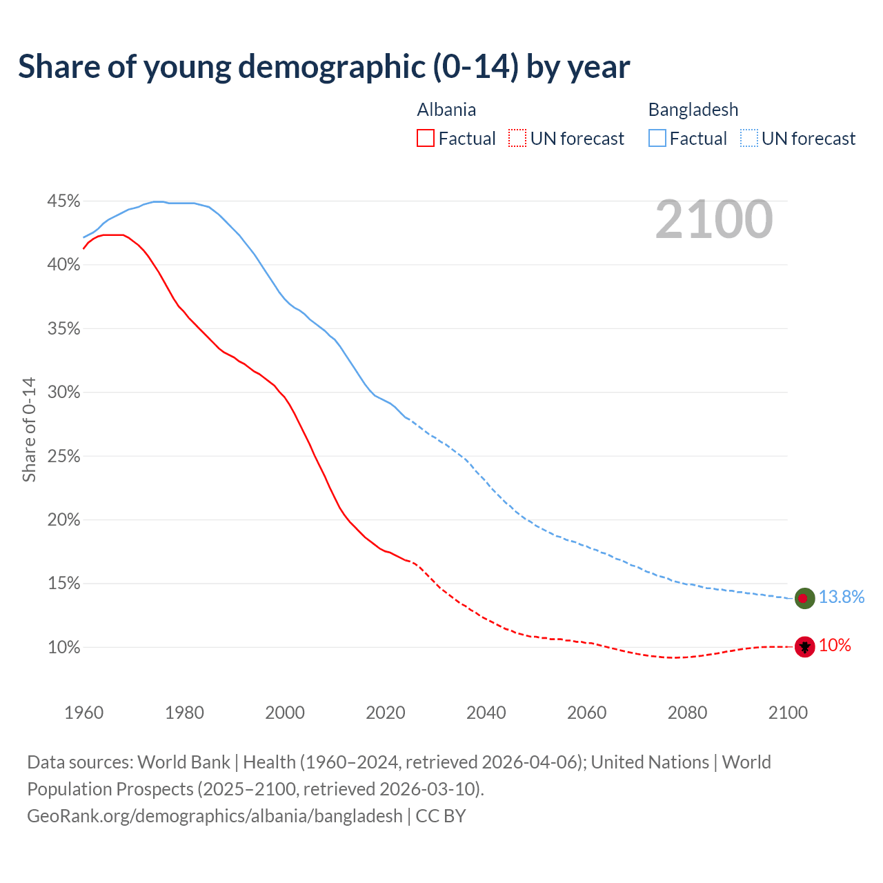 - The share of young demographic (0-15 years old) in Albania is 16.8% vs 28% in Bangladesh.