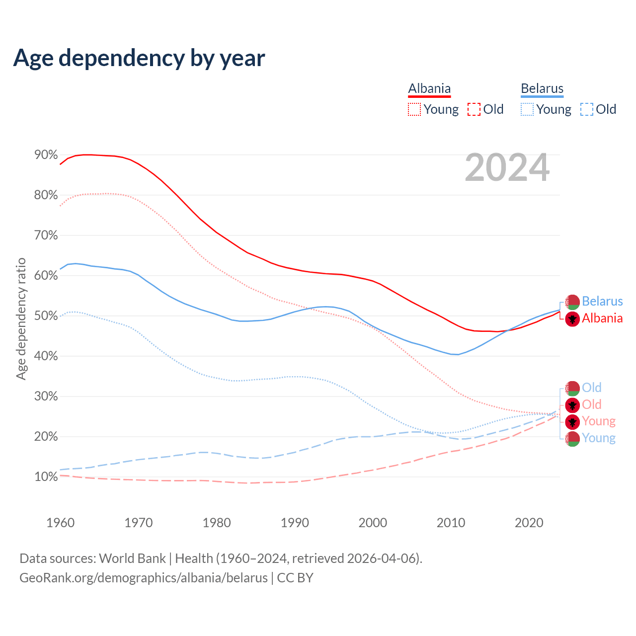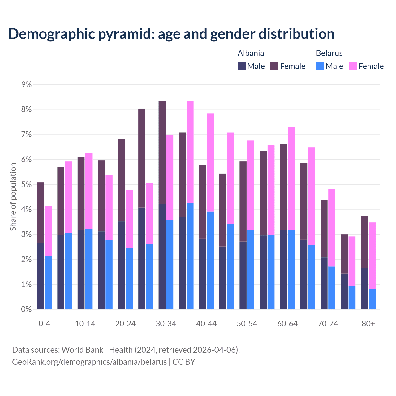 - Albania is ranked 60/196 by median age (oldest to youngest) vs 35/196 for Belarus.
