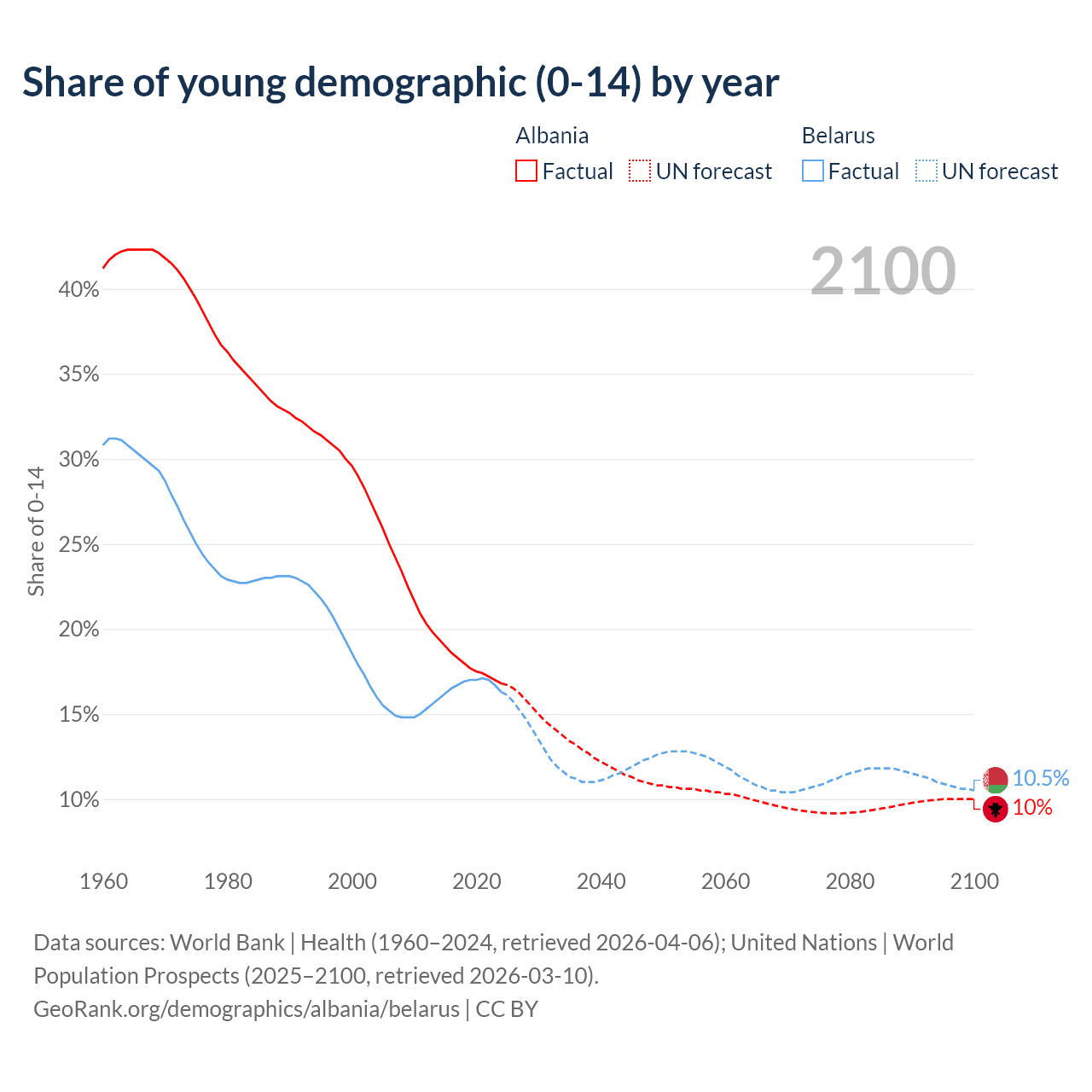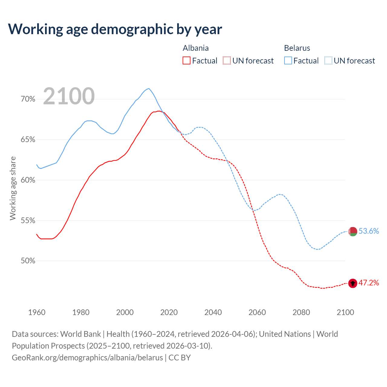 Median age Albania vs Belarus, 1960-2100