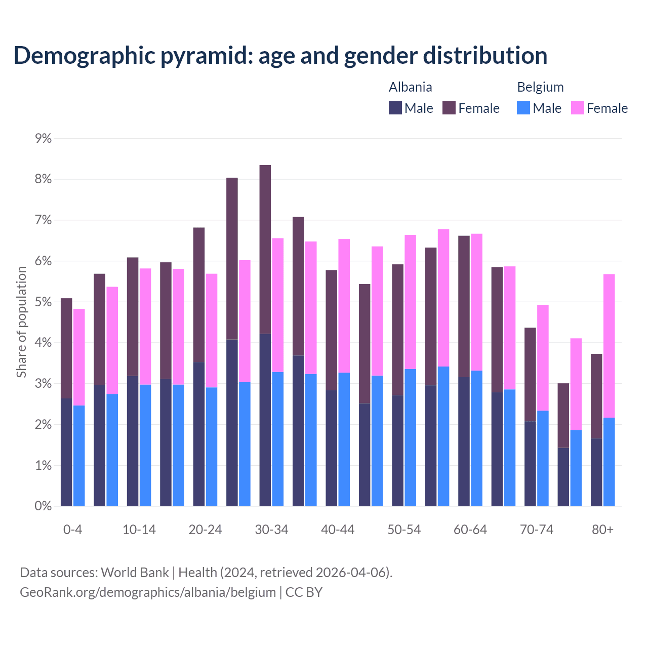 - Albania is ranked 60/196 by median age (oldest to youngest) vs 32/196 for Belgium.