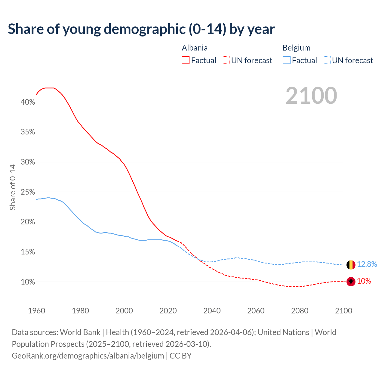 - The share of young demographic (0-15 years old) in Albania is 16.8% vs 16% in Belgium.