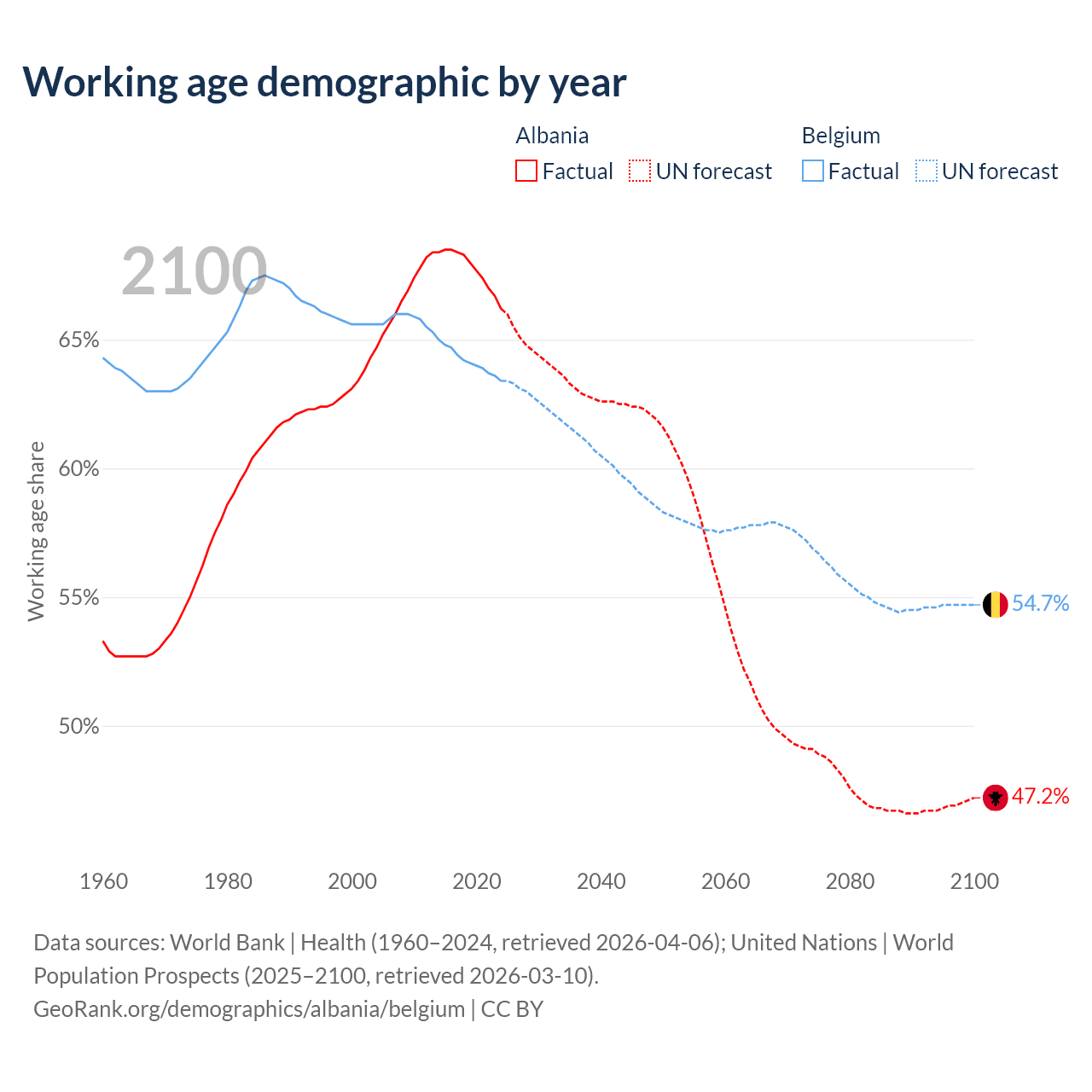 - Albania has 1.55M working age adults (aged 15-64) vs 7.55M in Belgium.