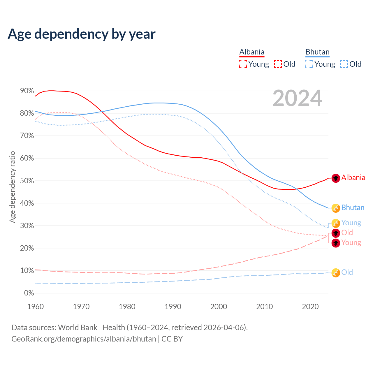 Data sources: World Bank | Health (1960–2024, retrieved 2026-04-06); U.S. Census Bureau (1960–2024, retrieved 2026-02-08).