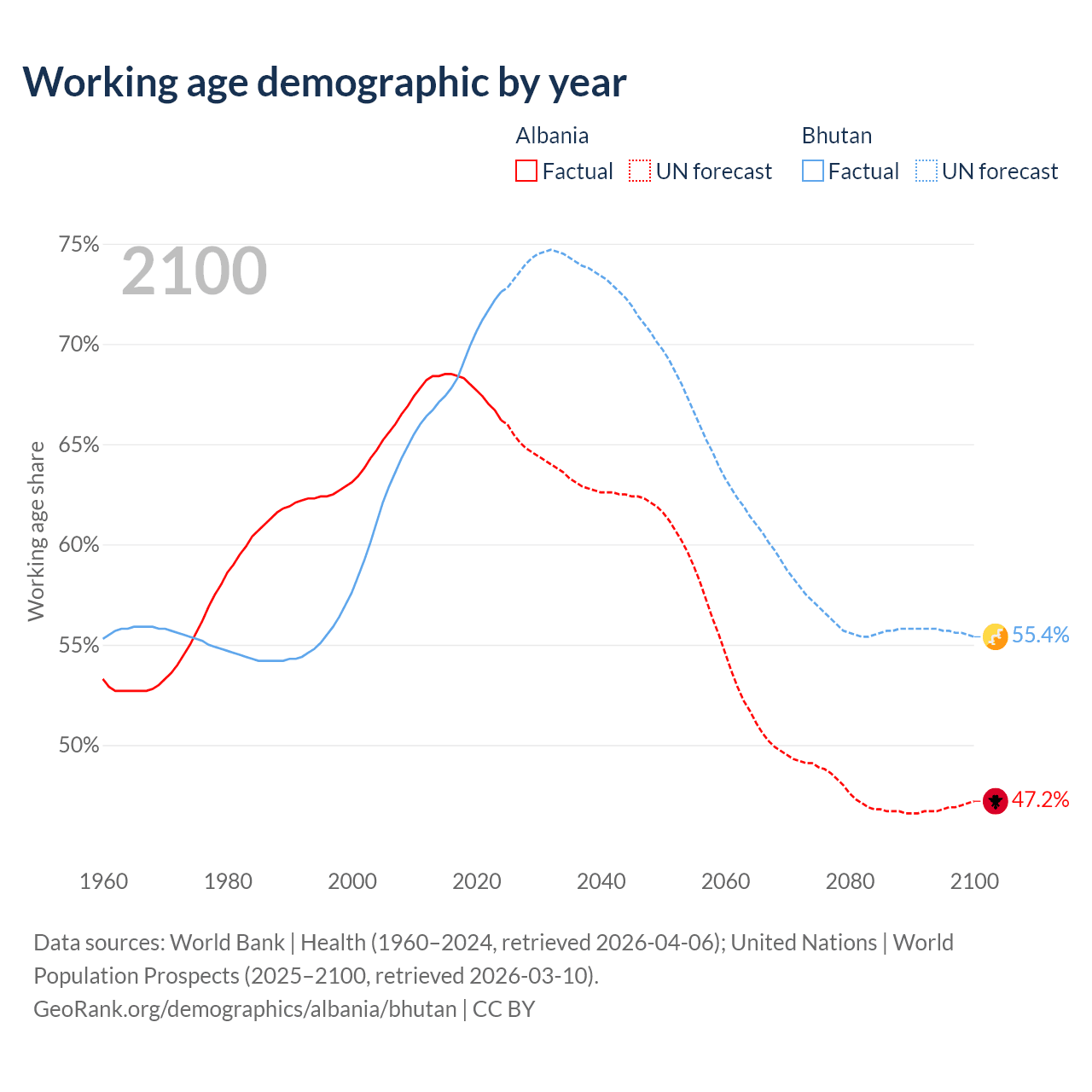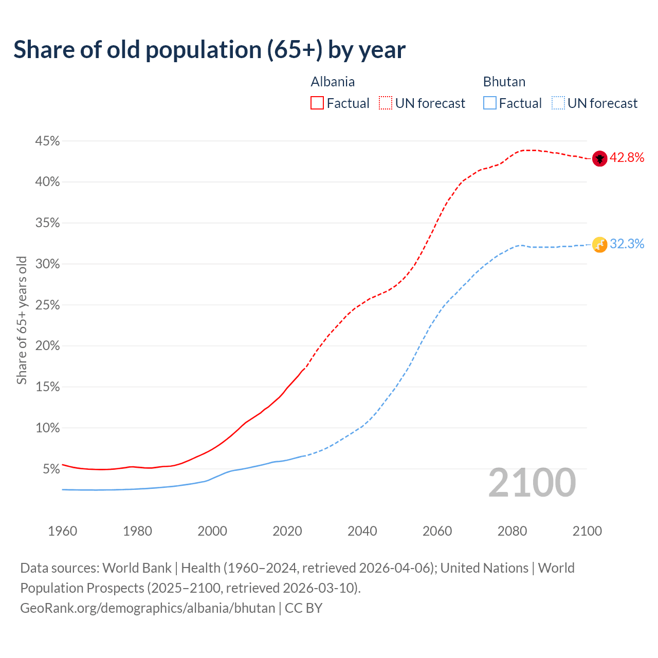 Median age Albania vs Bhutan, 1960-2100