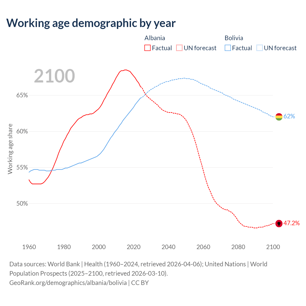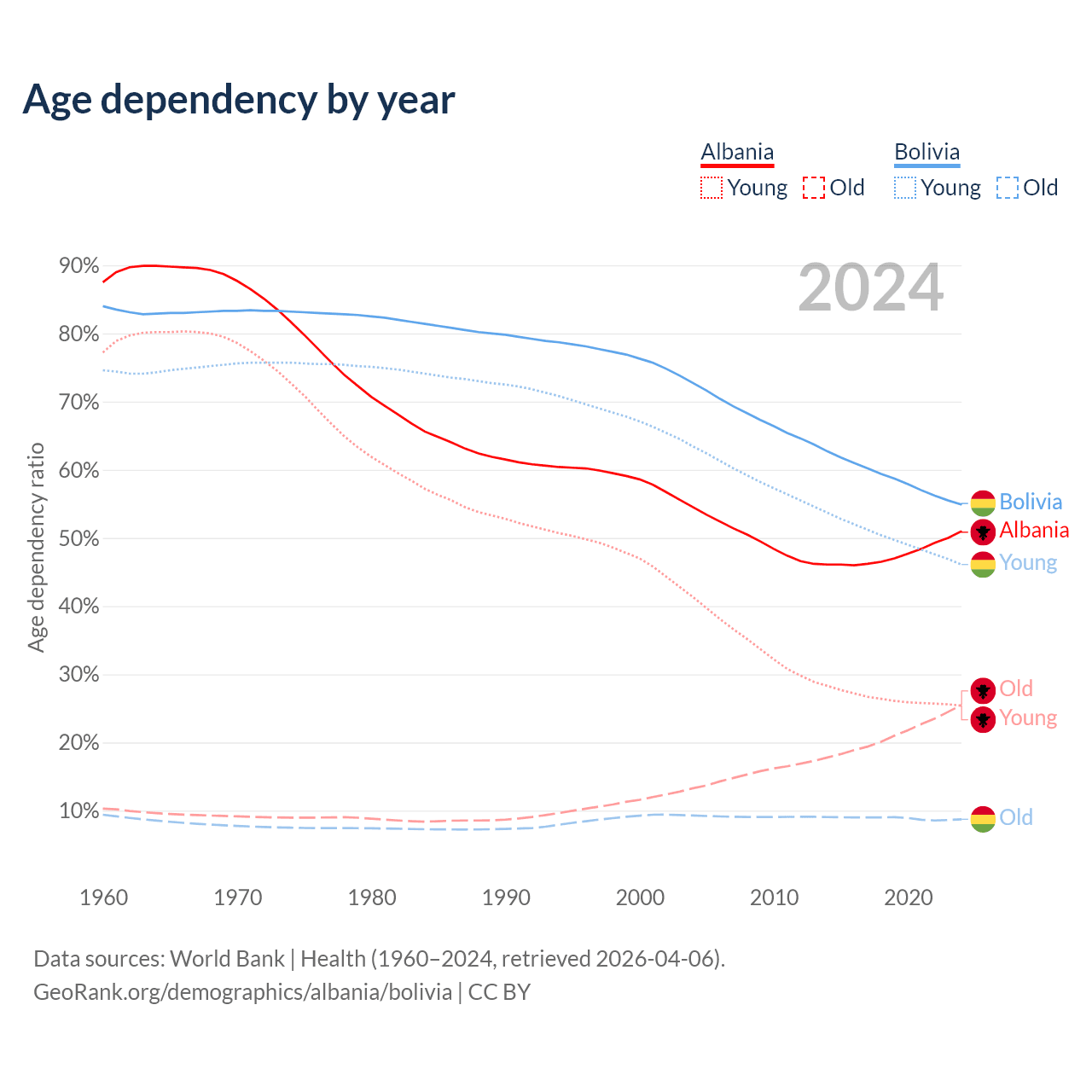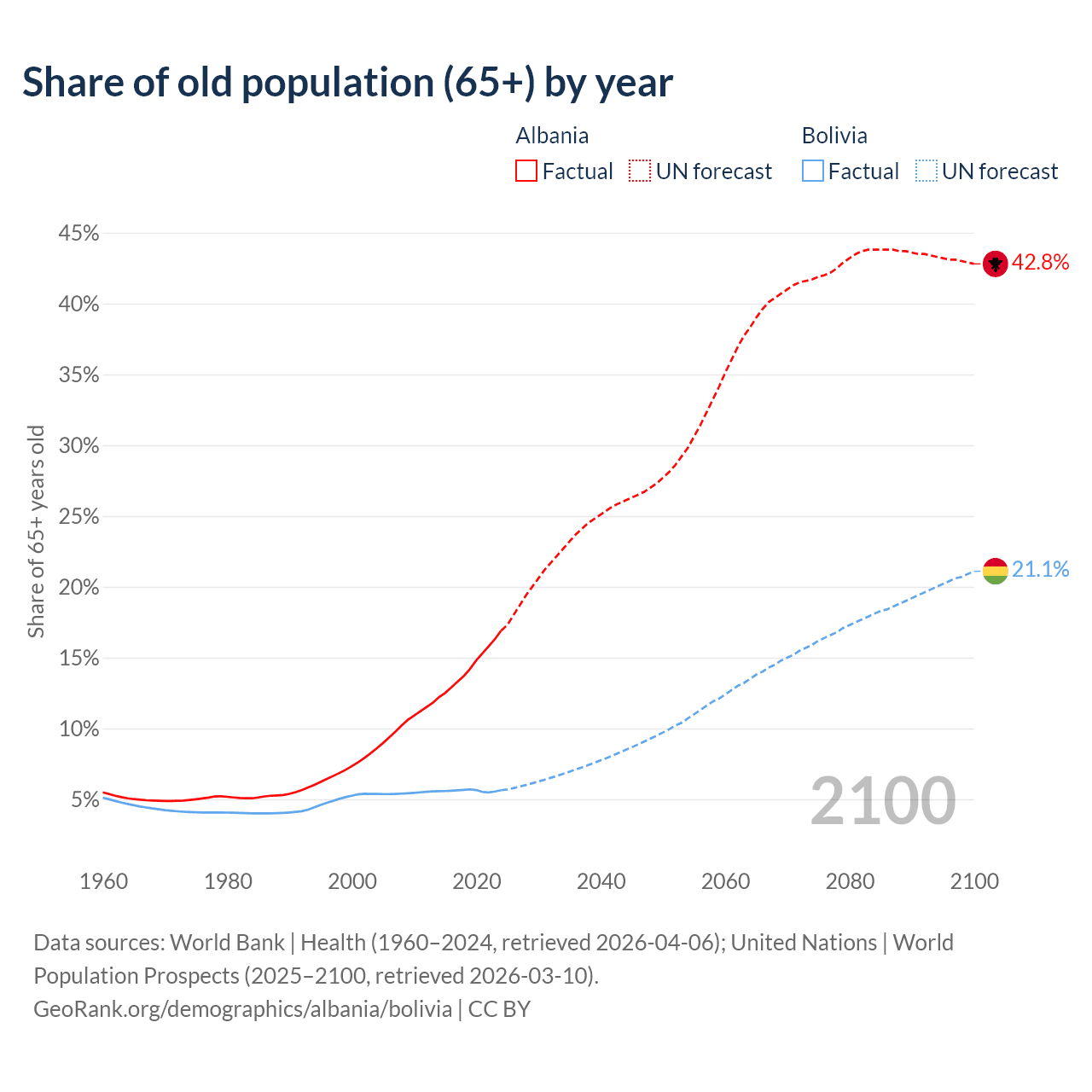 The share of older people aged 65 and over is 16.9% in Albania and 5.64% in Bolivia. Life expectancy in Albania compared to Bolivia .